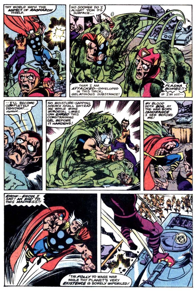 The Phantom tells Thor that he figures Mjolnir was pulled to Phantus, and so that’s where they must go if they are to retrieve it. But as the pair make planetfall, they find themselves in the middle of an all-out conflict, waged with frightening super-weaponry. It seems the Phantans are still in the middle of their never-ending time war. Thor throws himself directly into the battle, of course, but without his weapon, he’s at a bit of a disadvantage, and is forced to improvise in order to knock out his assorted attackers.
