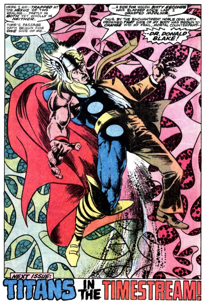 The Phantom tells Thor that all he needs to do in order to recover his hammer is to leap into the shaft, which will carry him to the juncture point where it certainly must be. The big dope goes along with the Space Phantom’s plan, little realizing that the alien is lying through his teeth. In fact, the Space Phantom intends to use Thor’s immortal body like a cork, to plug up the aperture that’s drawing Phantus into Limbo. But things don’t work out quite the way the Phantom had planned, for as Thor is trapped between Limbo and the outside universe, time begins to pass for the side of him that’s within the real world. And that means that the enchantment that says he must transform back into the mortal Doctor Donald Blake if deprived of his hammer is triggered, and half of Thor is so transmogrified! To Be Continued!