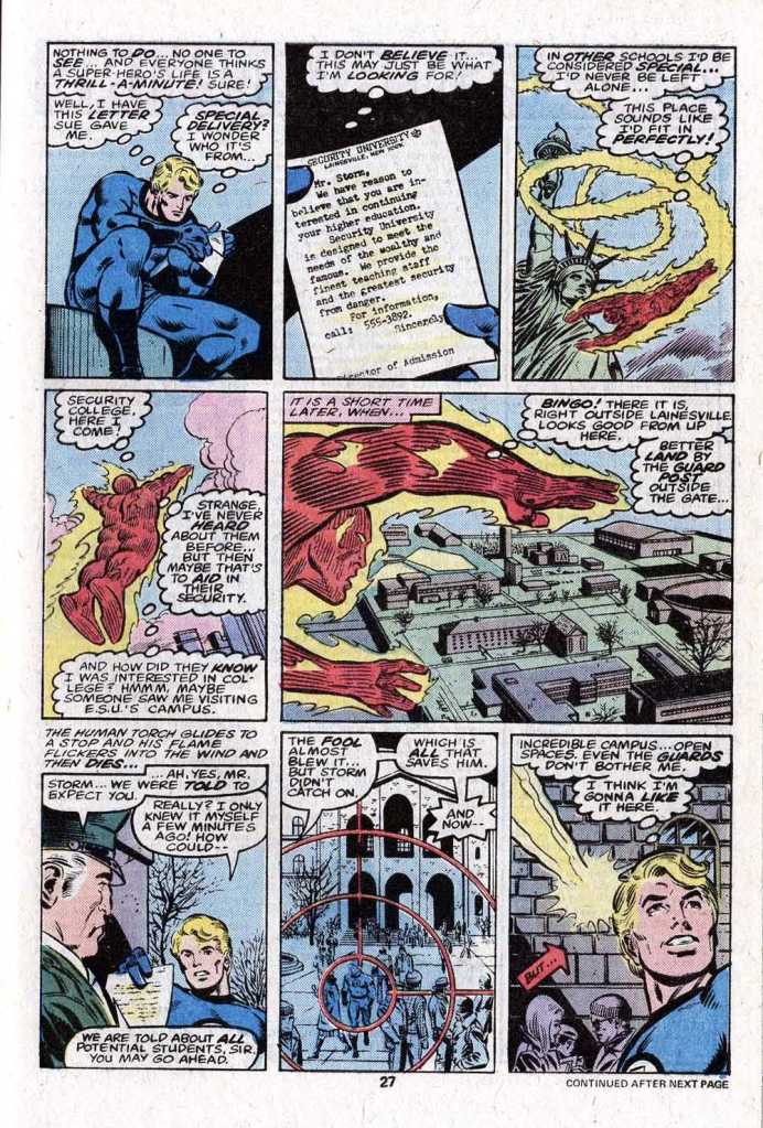 But to do so, he can’t be heading back off into space for who-knows-how-long with Reed and the gang. His fellow team members understand, and they take off for Xandar, leaving the Human Torch behind. Now once again at loose ends, Johnny seeks out somebody to talk to about his situation. But the Avengers are all occupied and Spider-Man is fighting the Man-Wolf in his own comic and is therefore unavailable to him. Johnny has received a special delivery telegram from the oddly-named Security University asking him to join its student body and promising an environment where the wealthy and famous can study unmolested by the outside world. Despite this seeming like an obvious trap, Johnny zooms off to the college to see about enrolling. Dope.