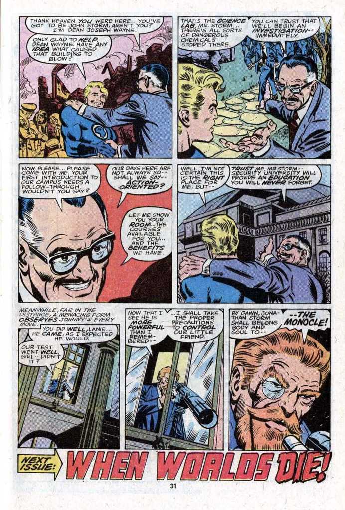 As the issue wraps up, the string-puller behind Johnny’s invitation causes an explosion in the science lab that requires the Human Torch to take action to save imperiled students. This earns him praise from the school’s headmaster Dean Joseph Wayne, and it seems inevitable now that the Torch is going to sign on for the learning experience, little realizing that everything has been a set-up. And we pull back to reveal the mastermind behind this whole deception. It’s the Monocle, one of the last and weakest villains created by Stan Lee and Jack Kirby in their final days as a team on the series. So while this was a callback to the past, it wasn’t an especially exciting one–the Monocle was a bit of a piker, and never intended as anything more than a one-off. But the pieces were now in place, and Marv would be splitting his time between the trio in space and the Torch on Earth across subsequent issues.