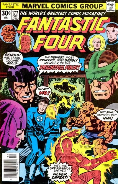 The first issue of FANTASTIC FOUR I had ever bought was this one, #177, which I picked up along with the next two issues, #178 and #179, from a local drug store that sold recent-but-old comic books out of a big bin. After several years of being turned off to Marvel comics due to a couple of bad early encounters with them, I’d finally taken the plunge after reading about the Golden Age Human Torch in THE STERANKO HISTORY OF COMICS and THE GREAT COMIC BOOK HEROES. To no great surprise, these books completely hooked me, and I started buying new issues immediately thereafter. I became a great admirer of artist George Perez and inker Joe Sinnott.