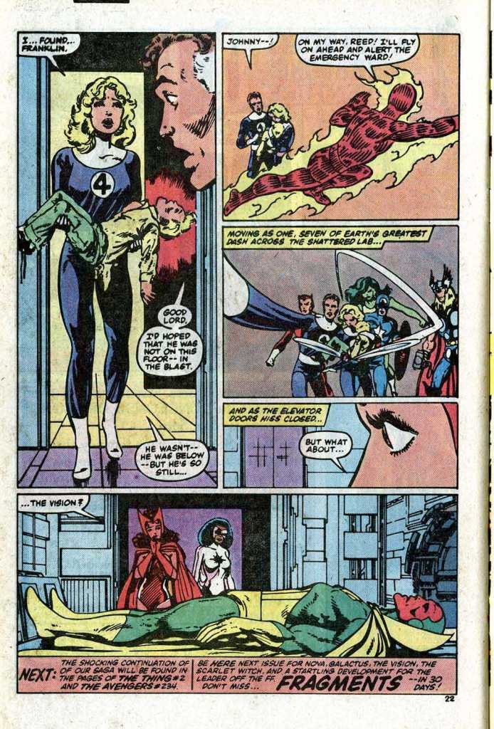 This was a situation that only lasted for about a year, though. What brought me back? Something of a fluke. My family had gone to a local supermarket to restock our pantry, and while I was walking around the place, I happened to check out the current issue of FANTASTIC FOUR that was then on sale. Flipping through it, I hit the last page in this issue, in which Sue miscarries her unborn child, and it hit me like a ton of bricks. But I didn’t buy the book just then. It took a couple of days. But that page, that moment, stuck with me. So I headed out to my local comic shop, Captain Blue Hen’s on Main Street in Newark, Delaware. But when I got there, they didn’t have any copies of the issue left, though the next one, #268, was already on sale, and so I picked that one up. And I went back to the nearby supermarket, where they still had the book on sale. But I was in high school at this point, and the thought of having to go through the checkout lane with only a copy of FANTASTIC FOUR to pay for, embarrassed me. I couldn’t bring myself to do it. So instead, I wound up concealing the issue on my person and walking out with it. Yes, I shoplifted this issue of FANTASTIC FOUR, the one that brought be back to the fold. It’s nothing I’m proud of–but it’s the way it was, so no sense concealing it.