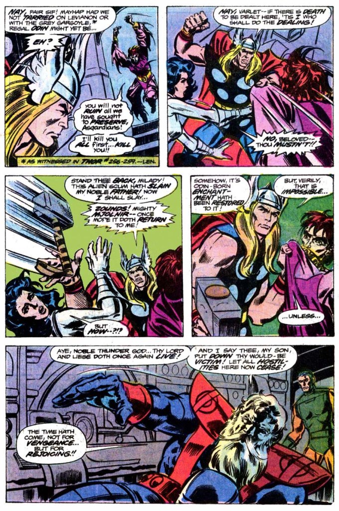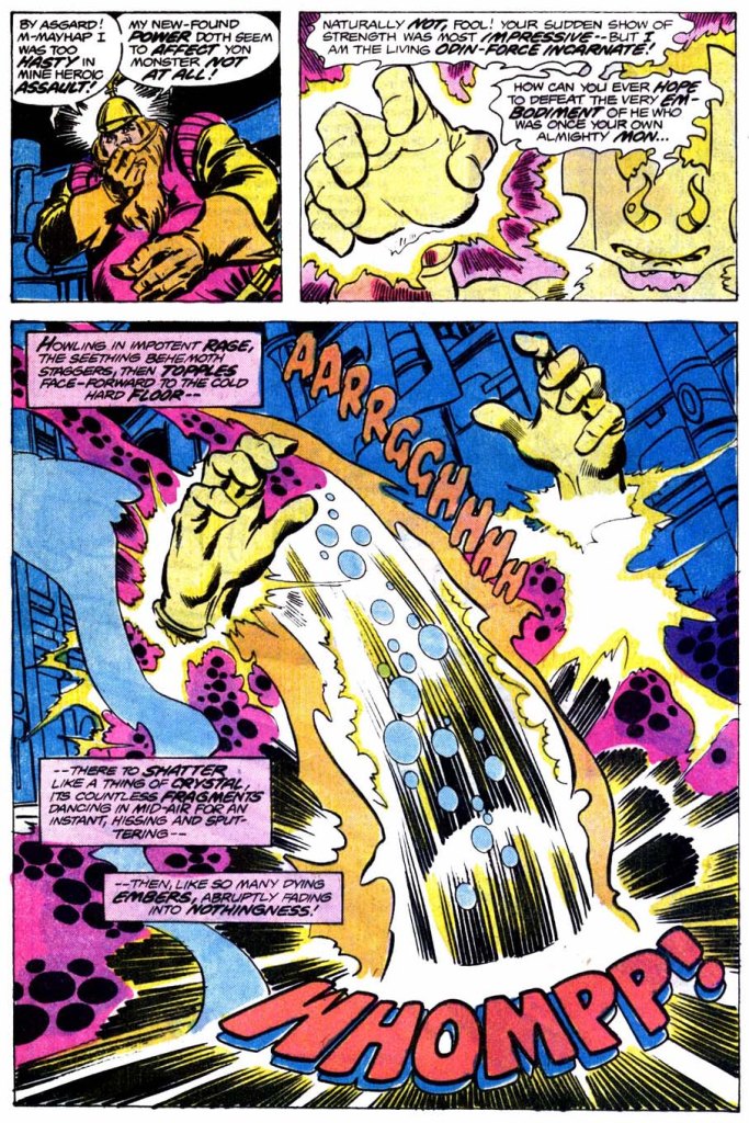 Thor races to teh side of his father, but Odin appears to have perished. And so, when K’rll, ravaged by the feedback to the Odin-Force creature that he was manipulating, enters in a murderous rage, Thor is just about ready to put him down for good in vengeance. But them, Mjolnir lies back to his hand, indicating that the All-Father may not be so demised as they had all through. Rising, Odin commands a halt be put to all hostilities. As he faltered, he of course passed along some of his Odin-Power to Volstagg for safe keeping, reasoning that so long as it existed, Odin could not truly die. And so it is thus.