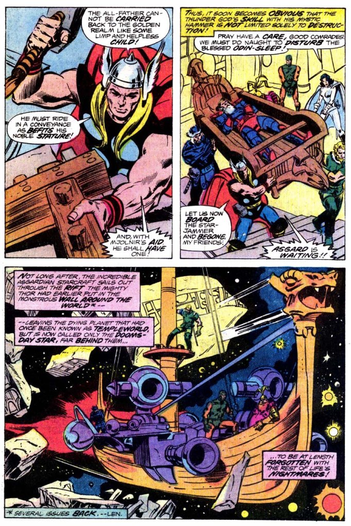 The rest of the issue is pretty much wrap-up, as Thor and the Asgardians make for home. Odin must enter the renewing Odin-Sleep to replenish his depleted energies, an so Thor and his crew craft a spectacular viking bed for him aboard their starjammer. They notably don’t solve the Templeworlders’ energy problem, but rather seal up the manner in which they entered the so-called Doomsday Star and leave them to their fate. This seems a bit cruel somehow–though it’s blunted in that we really only ever got to see two Templeworlders throughout this whole story. Still, though.