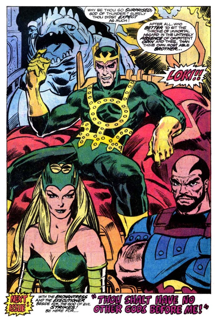 As the issue wraps things up, Thor’s ship returns to Asgard among cheering throngs overjoyed to hear of Odin’s return. But when they arrive, Thor and his friends are summoned to the Throne Room, where they are confronted by Loki and his allies the Enchantress and the Executioner. They have taken the throne for themselves, and this portents new conflicts to come in the next issue. To Be Continued!
