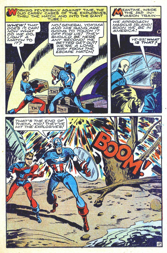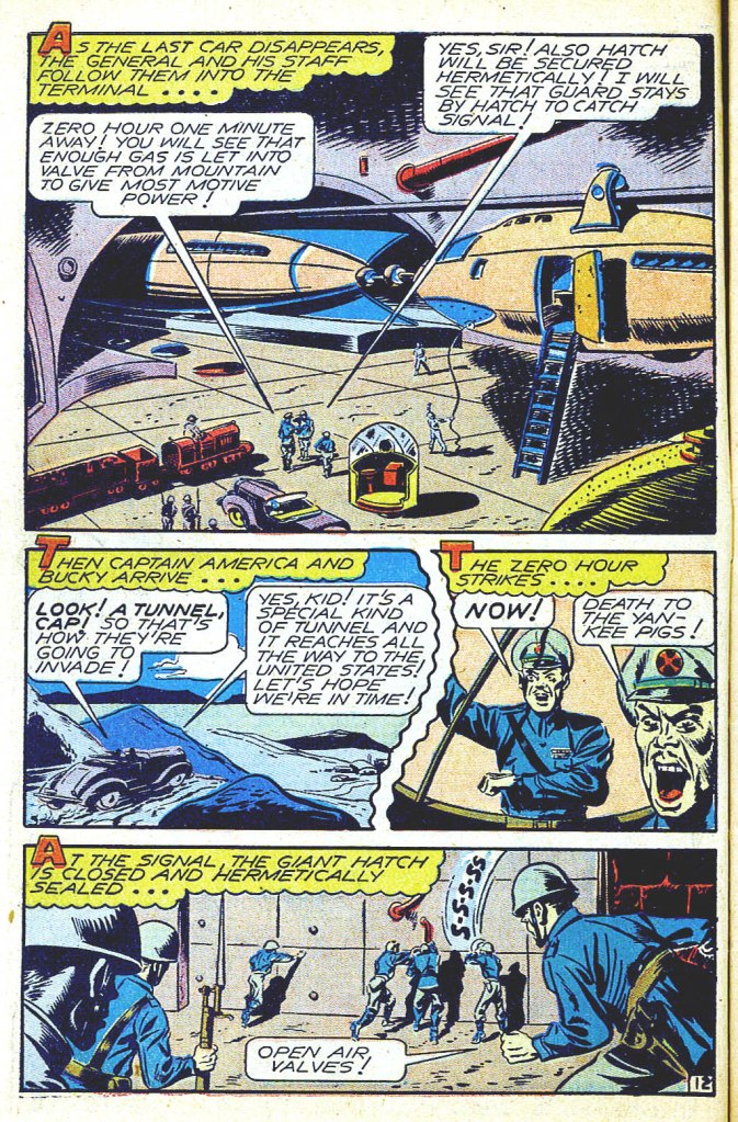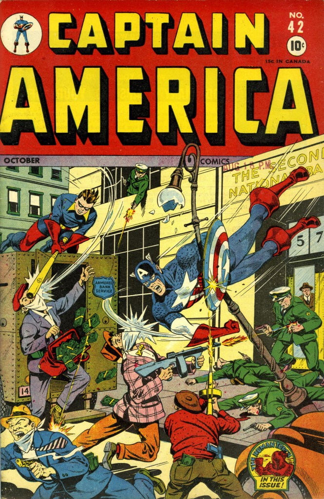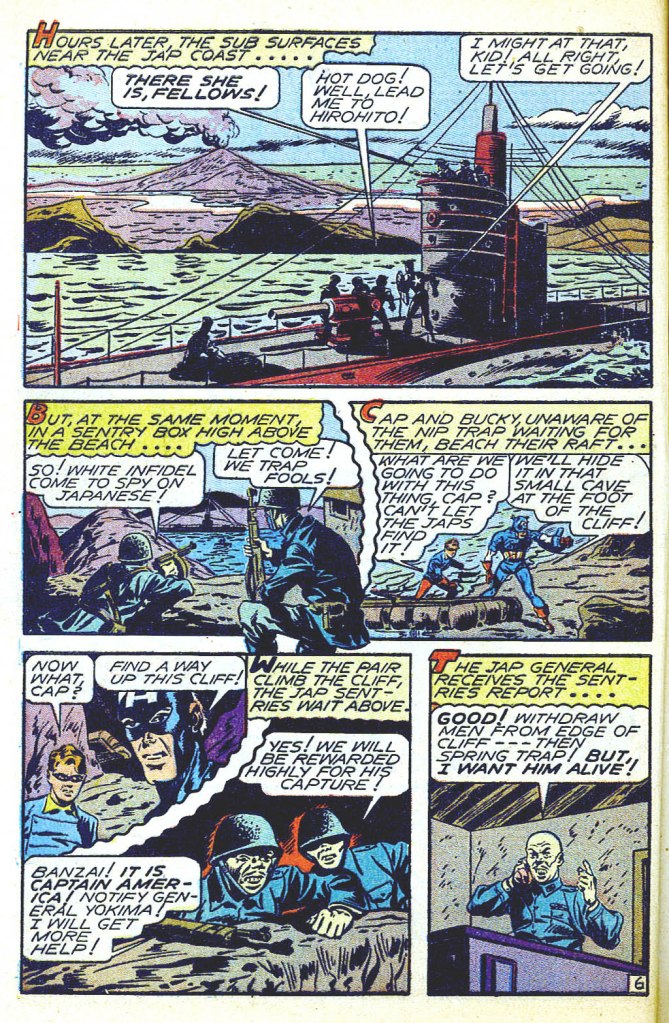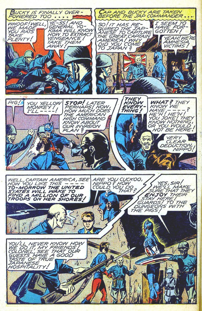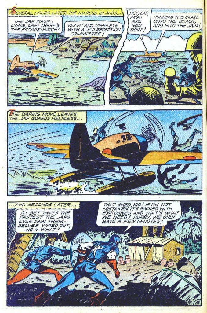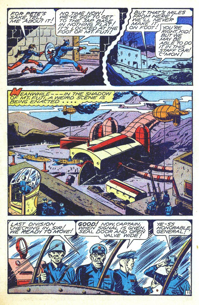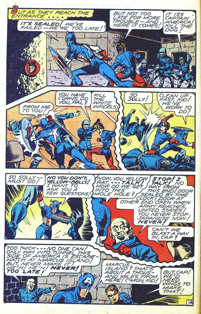 You are correct on the Geneva Convention: Not one civilian was among any of those Imperial Japanese troops Captain America & Bucky killed, nor were any of them surrendering at the time ( Not that hey had a chance to ). But I wonder what the body count would be up to when you add the OTHER INVASION TUNNEL WW2 STORIES: Nazi Invasion Tunnels to England – [ Marvel Mystery Comics#16 ( February 1941 ) Sub-Mariner story – Herr Kopf, Heinrich, Wilhelm ] & [ All-Winners Comics#3 ( Winter 1941-42 ) Destroyer story “The Secret Tunnel of Death!” – Dr. Dragon ] & [ Captain America Comics#36 ( March 1944 ) Captain America 5th story “The General of Death” — General von Savage ] & [ Sgt. Fury & His Howling Commandos#13 ( December 1964 ) ]. Imperial Japanese Invasion Tunnel, Singapore to Australia – [ All-Winners Comics#12 ( Spring 1944 ) Sub-Mariner Story “Smash the Tunnel of Terror!” — Captain Krashyu ]. Nazi & Imperial Japanese Invasion Tunnel to Alaska [ Marvel Mystery Comics#17 ( March 1941 ) Human Torch & Sub-Mariner story ].