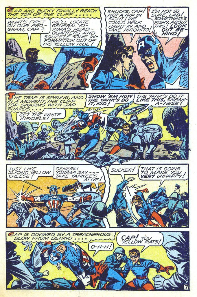 I should mention right off the bat this this story, which was released in CAPTAIN AMERICA COMICS #42 in 1944, is incredibly racist in its depictions of the Japanese. We’re at the height of wartime propaganda here, and so the enemy is shown to be literal inhuman monsters, gross racial caricatures, so that our side won’t feel bad about killing them. It’s pretty off-putting stuff to modern eyes, but at the time it was released, while Timely Comics, CAPTAIN AMERICA’s publisher, often went further than some other comic book companies in doing this, they were far from alone. Golden Age comics are rife with stereotypical depictions of all sorts of ethnic groups that haven’t stood teh test of time very well.