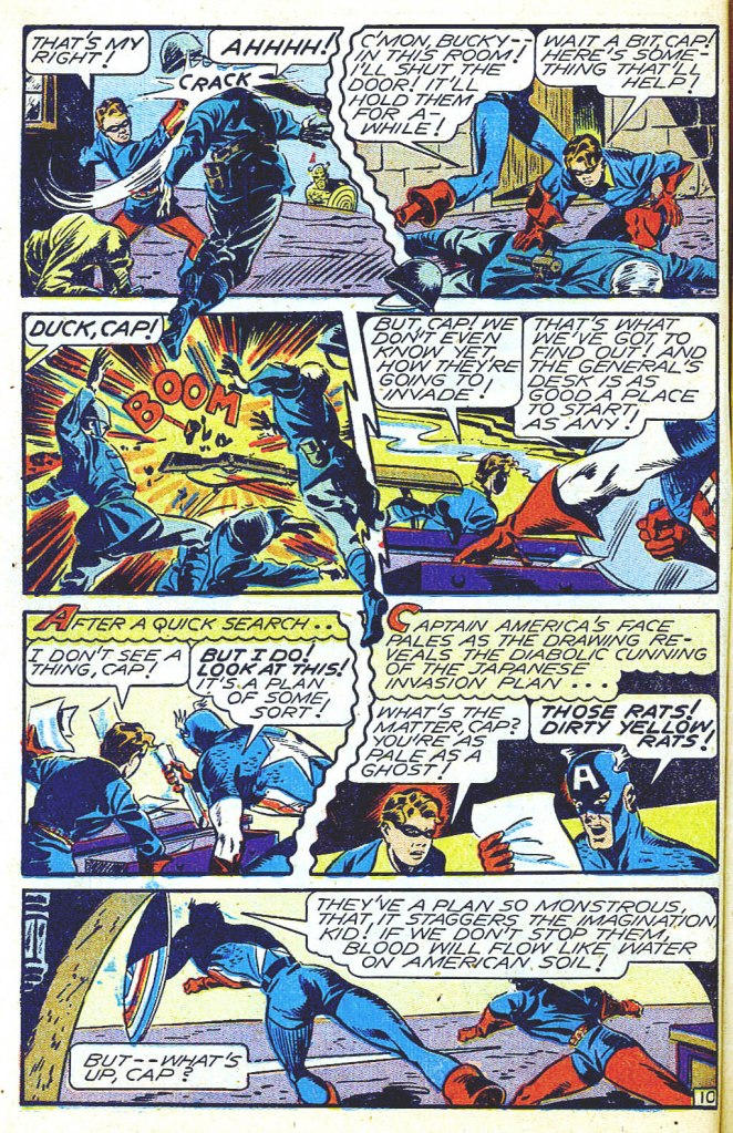 On page 10, panel 3, we’re shown on-panel Bucky directly killing three Japanese with a grenade. And Bucky is even more amazing than Cap. He’s doing all this stuff without the benefit of super-soldier serum, or even a shield. I’ve long thought Bucky as a character was actually one of the more realistic kid sidekicks in some ways, as in the real world plenty of young teens or even pre-teens do become soldiers when there’s a war. But on the other hand, they’re usually shooting with rifles, not doing acrobatic hand-to-hand combat.