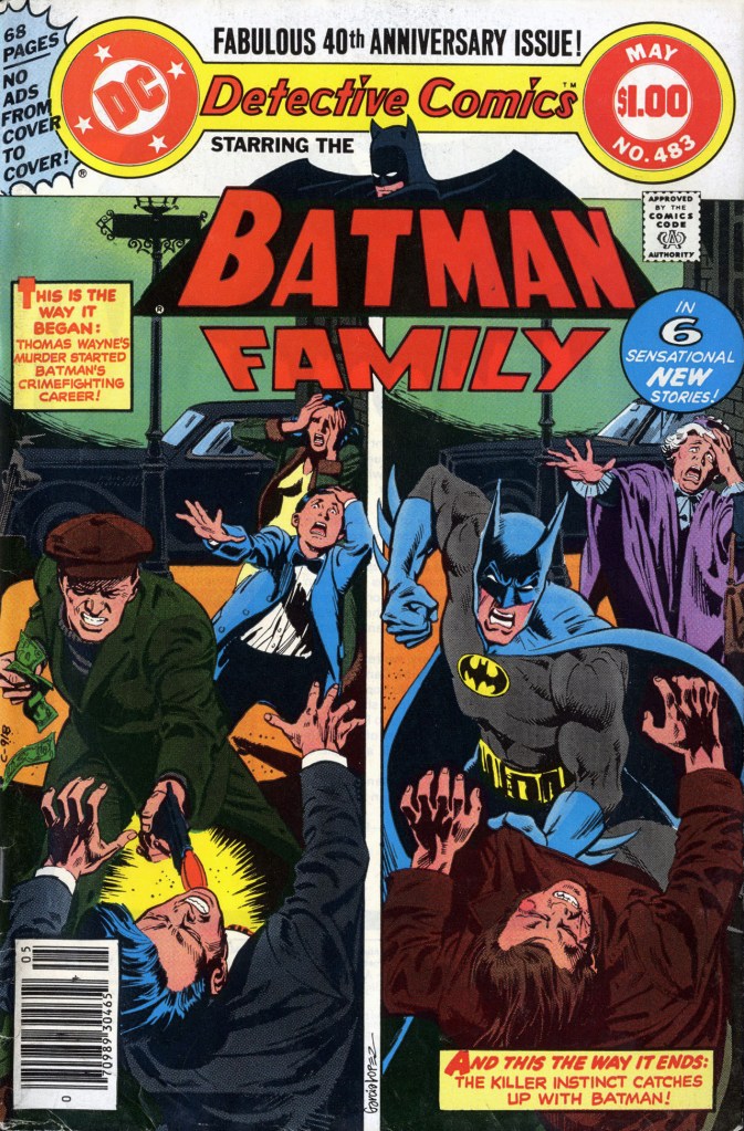 For almost the entirety of its run, I had been a regular reader of BATMAN FAMILY. But during the famous DC Implosion, in which DC’s publishing line was significantly pruned back, BATMAN FAMILY had been merged with DETECTIVE COMICS in an effort to keep the series that the company had been named after alive. Clearly, it worked, as DETECTIVE COMICS continues to be published to this day. But this meant that I stopped following BATMAN FAMILY. Why? Because my regular hook-up for new comics, my local 7-11, didn’t carry oversized books, which meant that DETECTIVE COMICS had stopped showing up there. I did end up with this special 40th Anniversary Issue of DETECTIVE, though, which indicates that I must have bought it at some other venue that my family happened to frequent that week. The fact that it was an Anniversary issue no doubt influenced my decision to pick it up, especially as the Huntress and Man-Bat features were no longer a part of the BATMAN FAMILY package.