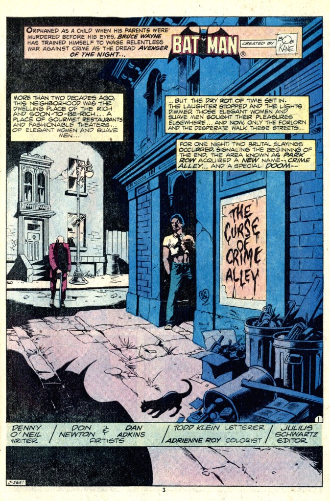 After an inside front cover editorial by editor Paul Levitz remarking on the 40-year history of the Batman, whose 40th Anniversary this issue marked, the first story in the issue was this one by Denny O’Neil and Don Newton. It referenced back to Denny’s earlier story that established “Crime Alley” as the place where Bruce Wayne’s parents had been murdered, so this was likely my first time encountering that fact. The story involves the gunmen of crazy crime-lord Maxie Zeus trying to smoke out an informant holed up in a tenement nearby to Crime Alley. They intend to flood the place with poison gas, heedless of the residents, in an attempt to flush their target out into the open. But the real struggle for Batman in this story is to not give into his worst, most violent impulses and kill any of these heartless men. With the aid of Leslie Thompkins, he does just that. Nice artwork on this job by Newton.