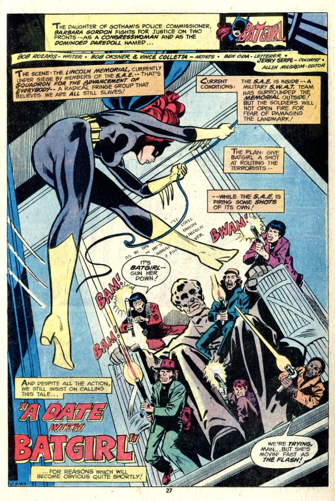 Next up is a Batgirl story written by Bob Rozakis whose pencils by the talented Bob Oksner are done absolutely no favors by the time-conscious inkwork of Vince Colletta. This is the third story in the issue, and each one so far has listed a different editor, a good clue that the book was being used to burn off inventory that had been accrued intended for assorted titles for some time. It’s a fun but silly little tale in which Batgirl is asked on a date by a soldier that she’s encountered twice now. She agrees, and their evening becomes a series of nutty occurrences, given that she’s in full Batgirl regalia for the entirety of the evening. But along the way, she and the Soldier wind up saving the Washington Monument from an attack by terrorists, so that isn’t nothing.