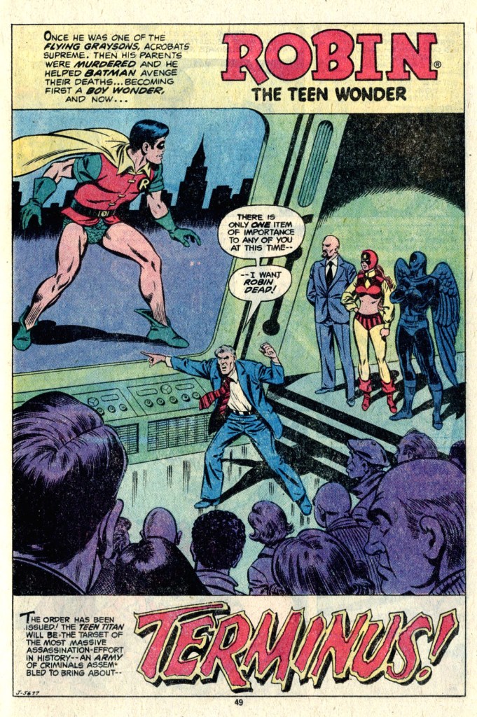 The next feature was a Robin tale also written by Bob Rozakis and illustrated by the charming Kurt Schaffenberger. Schaffenberger’s open, playful artwork wasn’t really all that good a mix with the darkness of Batman’s world, but I always found it appealing no matter what feature he was working on. In this one, Robin works to take down the criminal cartel Maze, contending with a pair of costumed agents for that organization, the Raven and Card Queen. It turns out, though, that Card Queen is a plant–she’s really Duela Dent, the Harlequin, Robin’s Teen Titans ally undercover, and so that helps to turn the tide. It also turns out that the Raven is secretly Dave Corby, Dick Grayson’s rival for the affections of longtime girlfriend Lori–and so he delights in revealing Dave’s true identity in his Dick Grayson guise, and humiliating him in front of Lori. This is framed as a big heroic moment, but it somehow seems a bit petty and cruel, too, even if Corby is a mob hitman.