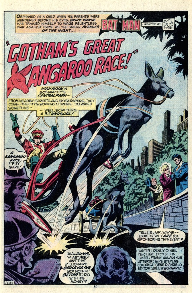 And the final story in the issue is another short Batman tale by Denny O’Neil, this one illustrated by Dick Dillin and edited by Julie Schwartz. it was probably intended as a back-up for BATMAN in its DC Explosion 50 cent incarnation. In it, Bruce Wayne sponsors a Kangaroo Race of all things for charity as a means to smoke out “Swagman” McGinty, a local terrorist who is also a specialist with Kangaroos, and who will doubtless compete in the race and win it since he needs a stake to pay for a weapons shipment that’s headed into Gotham. Which he does–taking Batman’s bugged prize money with him for his efforts. through it, Batman is able to crash the exchange and capture not only McGinty but also the arms merchant who is furnishing him with weapons. Batman actually accepts the reward out on the gun runner, anonymously gifting it to a local charity in need (and matching it with Bruce Wayne’s own money in the bargain.)