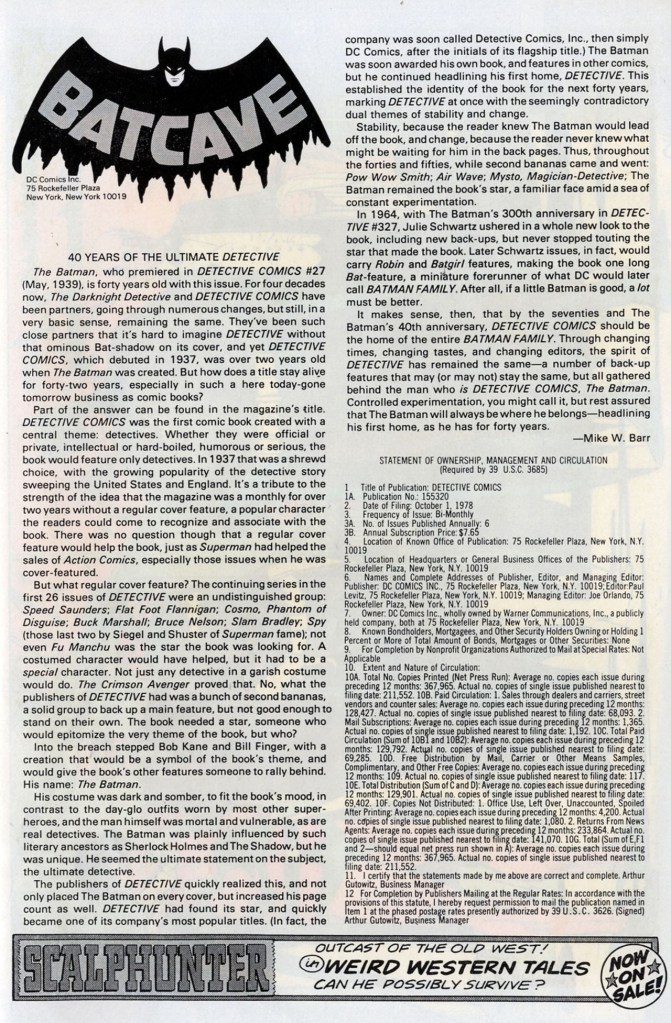 The inside back cover of the issue is mostly taken up by an essay by Mike W. Barr talking about the creation and history of the Caped Crusader and his place in DETECTIVE COMICS’ history. But it also carried this year’s Statement of Ownership, which tells us that DETECTIVE COMICS had been selling 69,285 copies on a print run of 211,552, giving it a miserable efficiency rating of just under 33%. You can see why the book was on the chopping block and why extraordinary measures needed to be taken in order to save it.