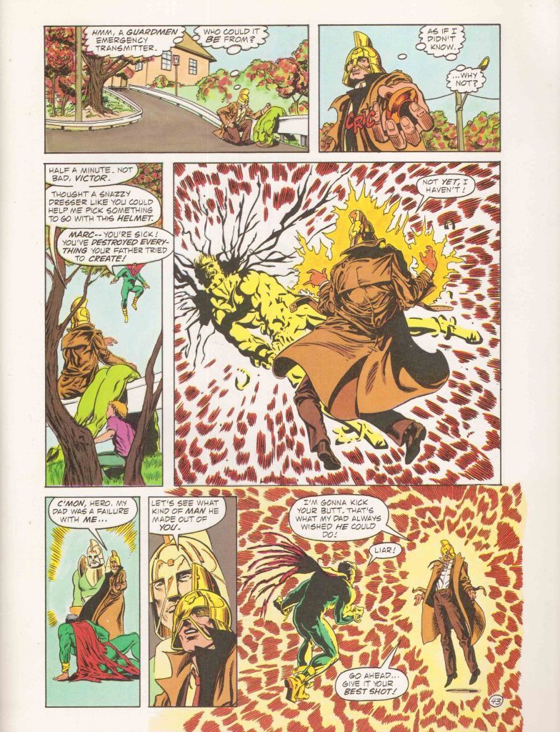 Victor walks away from the Guardmen, and so he wasn’t present when some time later, their headquarters was attacked and destroyed by their enemy Sepulcre, killing the entire team. Realizing the need for an organization that can help provide leadership and guidance for the new generations of super heroes who are cropping up, Victor is inspired to set up the Hero Alliance–not a team in the classic sense, but more of a support group that can help to pass on the classic ideas of herodom to a new generation. So very much what the Justice Society would be doing in the years ahead. Closer to home, Victor winds up having to battle the son of the Golden Guardsman, who is corrupt and selfish and who uses his father’s old power helmet to augment his already-formidable abilities. The creators were clearly looking at Moore’s Kid Marvelman in their depiction of the character, but their take was a lot flatter and less nuanced than what had been done previously.