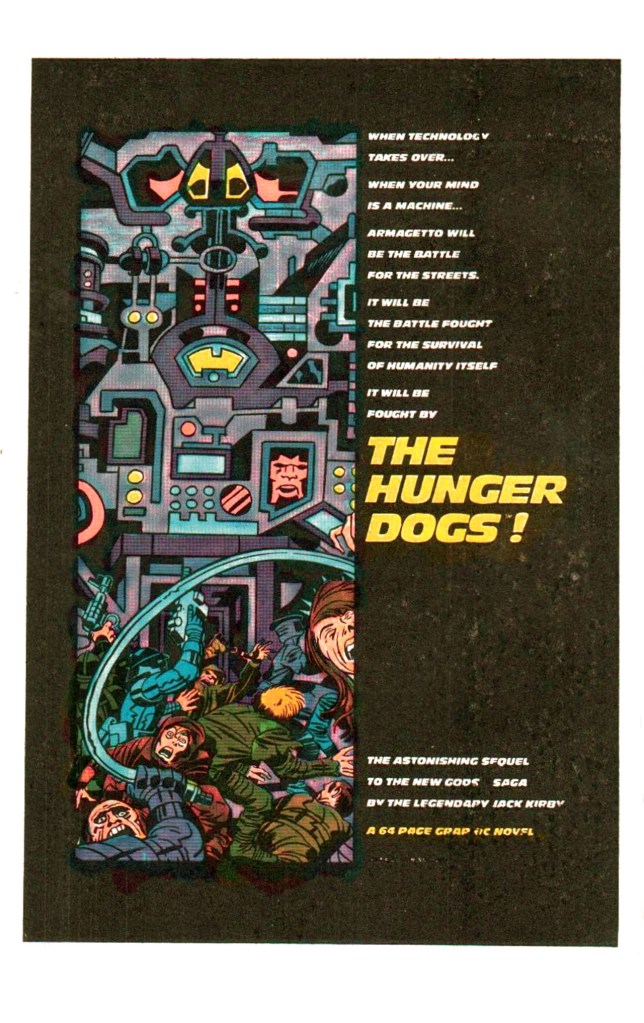 As always, Jack Kirby’s promotional copy for this era is unmatched, his particular facility with bombast well in evidence. The HUNGER DOGS graphic novel was another attempt to wrap up Jack’s Fourth World trilogy, but it ran into some conflicts with current DC publishing goals and so it didn’t quite accomplish what it had set out to do.