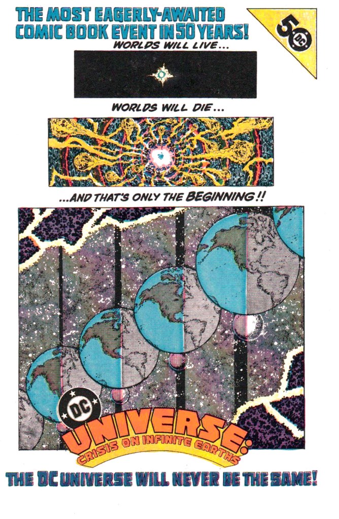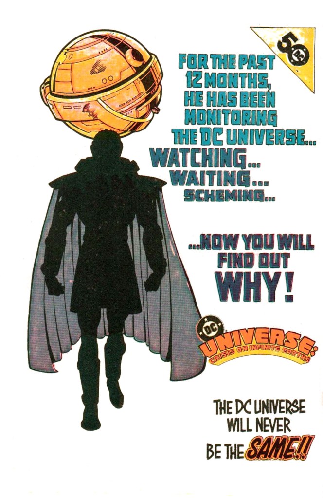 The Monitor had been showing up in DC titles all across the line (including in such unlikely places as SGT ROCK and JONAH HEX.) Now, the company was ready to roll out the introduction to their enormous continuity-streamlining event, CRISIS ON INFINITE EARTHS. Though at this point, the title was given as DC UNIVERSE: CRISIS ON INFINITE EARTHS.