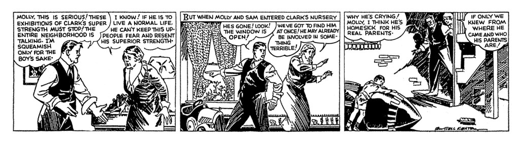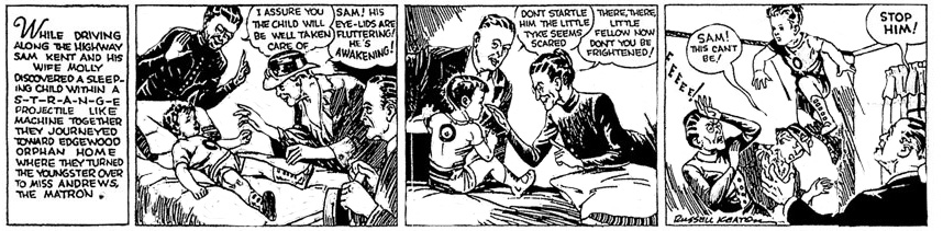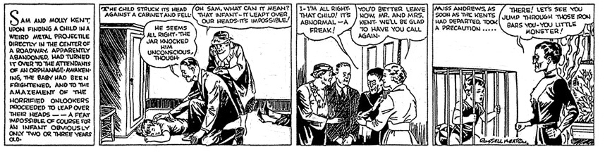 The sample strips that still exist for this run of SUPERMAN skip the set-up , opening instead with the time machine appearing in 1935 for the first time and being found by Sam Kent and his wife, Molly, who adopt the child.