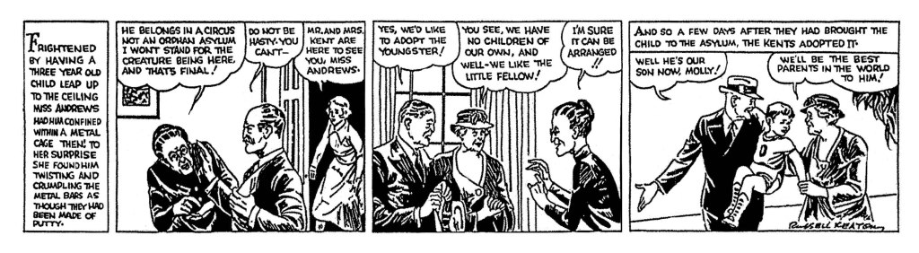 After their failure to sell Superman to Humor Publishing Co. in 1933, Shuster had destroyed the originals for that prototypic version of the Man of Steel in a fit of anger and depression. Siegel, though, hadn’t given up on their brainchild–but he did some to think that maybe the problem with their pitch was his choice of artist. Siegel really saw Superman as his individual creation, and thought of his artist as a pair of hands with which to realize it in comic strip form. He approached a number of other artists with the proposition to team up and develop the concept with him, including Leo O’Mealia and Russell Keaton. While no examples of O’Mealia’s Superman samples have ever turned up, assuming that he got that far, there is a batch of material extant for the Siegel/Keaton version. And that’s what we’re going to look at today.