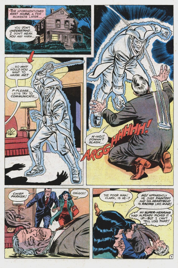 Turns out the scream came from Lois, who is confronted in her guest bed by an apparition of a World War II-era general, who threatens her with a gun. By the time Clark and Chief Parker can get to her, though, teh ghost has vanished and Lois is unharmed though shaken up. But what’s more, there isn’t any physical evidence of the ghost’s presence that Superman can detect with his super-vision. What he does learn, however, is that the fingerprints that he earlier discovered on the secret S-emblem are identical to those of chief Parker. So the Chief must have been the one who sent that letter to teh Daily Planet. But Superman can’t believe that Chief Parker means him any ill, and so he figures that the old law officer must be possessed by some spirit that is causing him to do things against his will and without his knowledge. Because yeah, that tracks, obviously.