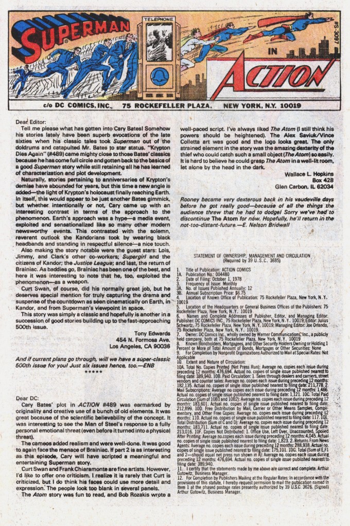 This issue of ACTION COMICS included the yearly Statement of Ownership on its SUPERMAN IN ACTION letters page. And it tells us that, over the previous year, the book had been selling 213,076 copies on a print run of 389,940, giving it an efficiency percentage of just under 55%. That’s a good percentage for this era, and no doubt is reflective of the building excitement for the then-impending SUPERMAN film.