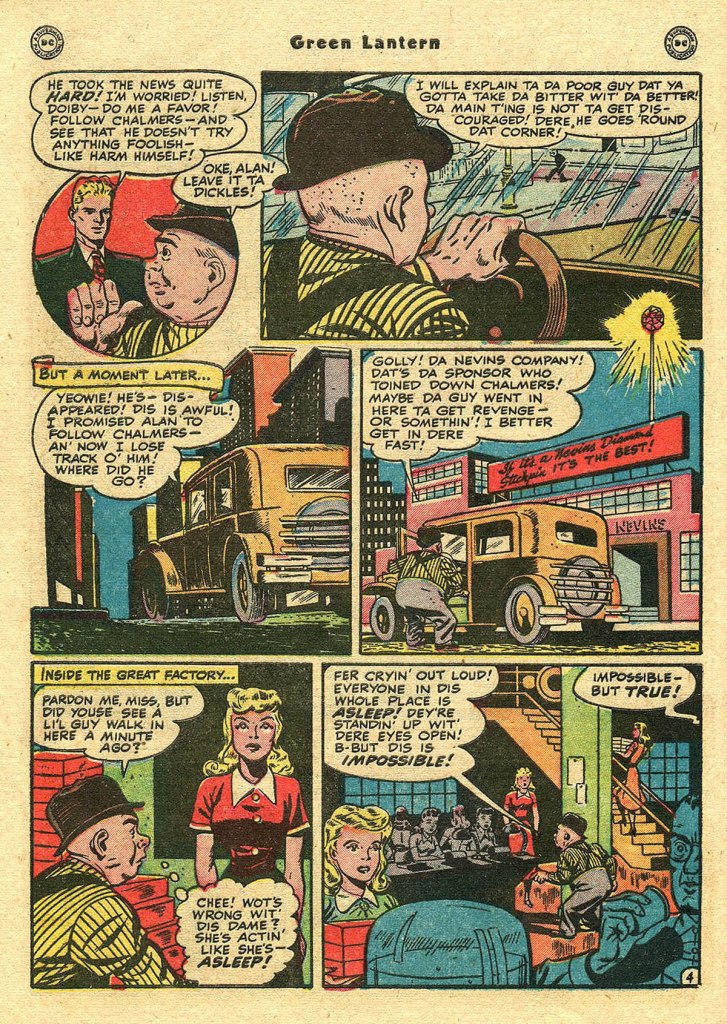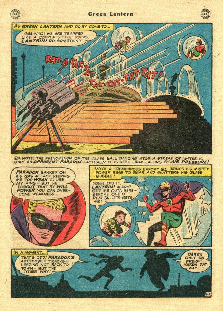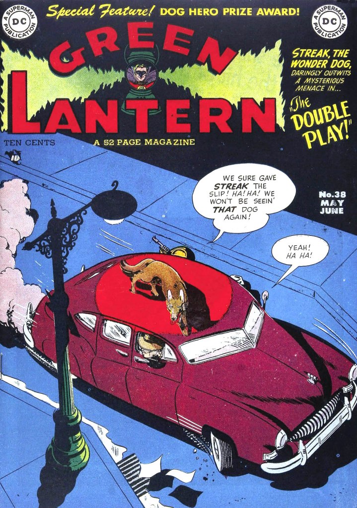 As opposed to the Flash and the other members of the Justice Society of America whose solo series all were discontinued in the pages of the anthology series they were a part of, Green Lantern actually made his final Golden Age solo appearance in his own title, which outlasted ALL-AMERICAN COMICS’ transformation into ALL-AMERICAN WESTERN by a few months. This was a double-edged thing, though, because by this point the Emerald Crusader had been pushed off of the cover of his own magazine by Streak the Wonder Dog, a canine character introduced a short time previously. You can almost feel Alan Scott thinking about the fate that befell fellow member Johnny Thunder after the Black canary showed up in his strip, ousting Johnny from it in just a few issues.