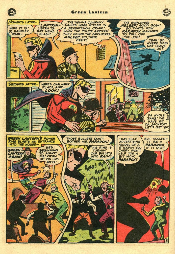2. John Minehan thanks for motivating me to look for the first appearance of the oath in this issue ( I knew I had seen it before, especially since comics.org does not mention it in this issue ): All-American Comics#53 ( October 1943 ) like you pointed out Alfred Bester — “In brightest day, in blackest night, no evil shall escape my sight. Let those who worship evil’s might, beware my power, Green Lantern’s light.” There are also variations oaths in issue 18, 20, 23, 45 & 47, plus in one of the issue between those is Alan Scott’s middle name Wellington.