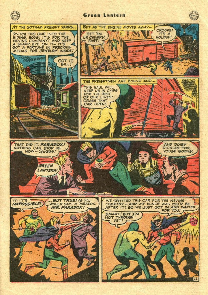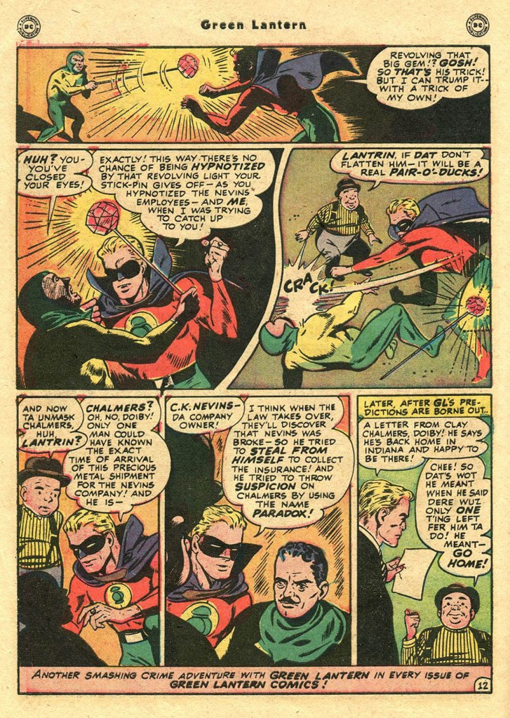 GREEN LANTERN #38 contained two Green Lantern stories bracketing a Streak solo adventure. So for our purposes, the second of these qualifies as the hero’s final solo adventure. Of course, he’d continue on in his capacity as a member of the Justice Society of America in ALL-STAR COMICS for another year or so.