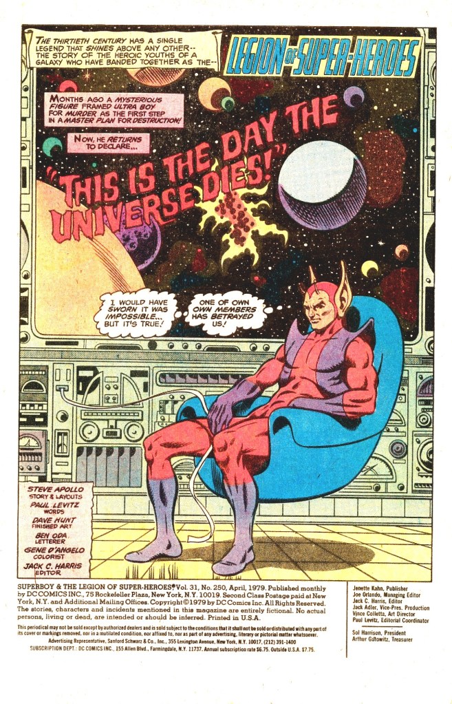 This was a pretty good-looking issue, thanks to the work of the mysterious Steve Apollo. For those who may be unaware, Steve Apollo was a pseudonym. This story had actually been started months earlier, intended for an issue of the oversized DC SPECIAL SERIES, which had been discontinued. It was the sequel/follow-up to a story that had come out now more than a year earlier, in which some secret mastermind had framed Ultra Boy for murder. But in order to fit it into current continuity, scripter Paul Levitz was forced to break it in half and even shuffle around certain elements of it. Starlin wasn’t happy with the way his story had been manhandled here, and so he requested that his name be taken off it. Hence, Steve Apollo.
