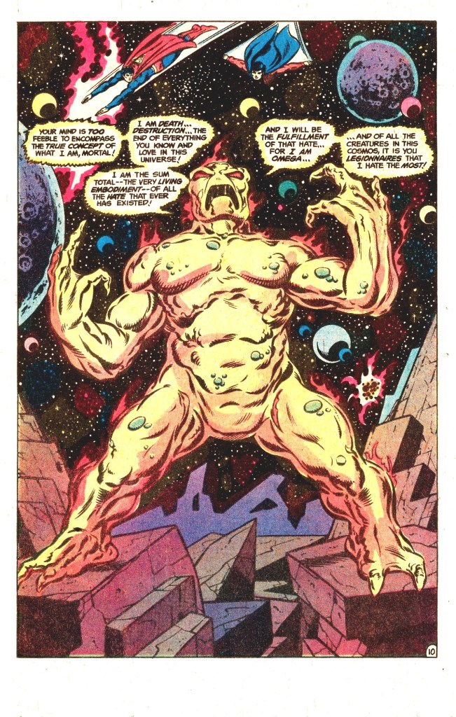 And so, the entire Legion assembles to try to get to the bottom of this puzzle. But a hologram of their secretive foe materializes in their midst to taunt them. The hooded figure tells the Legion that he intends to play a game with them–and should they lose, the entire universe will be destroyed. Suddenly, an alarm goes off signaling a threat of such magnitude that it cannot be ignored. Superboy and Mon-El race across intergalactic space as the ones able to get there the fastest, only to discover a gigantic cosmic creature calling itself Omega. Omega tells them that it intends to destroy the universe in the fulfillment of its creator’s grand desire. And it proves too powerful for Superboy and Mon-El to take on alone.