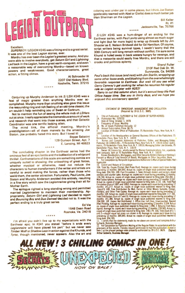 The Legion Outpost letters page contained this year’s Statement of Ownership, which gives us a glimpse into how well the book had been selling across the previous 18 months or so. According to the data, SUPERBOY & THE LEGION had been selling 204,473 copies an issue on a print run of 354,765, giving it an efficiency rating of just under 58%. That’s a pretty strong percentage relative to most of the other titles from this period that we’ve been looking at.