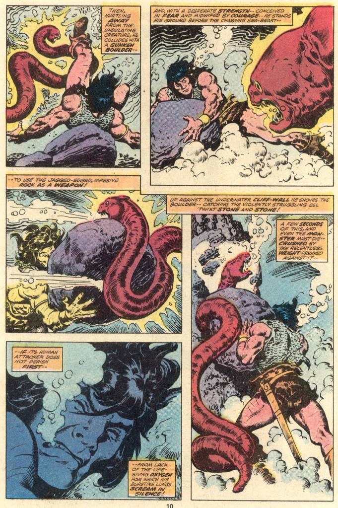 This issue opens with Conan and his lion companion Sholo walking through the forest. He’s in search of his abducted paramour Belit, the Queen of the Black Coast, who was abducted by the beast-controlling sorcerer Ajaga earlier. On the way, as they head into a cavern, they fall through a trapdoor into a raging river, and Conan is forced to do battle with a seriously large undersea snake, eventually bashing its brains out against an outcropping with a large bounder that he hefts. But he’s too oxygen-deprived by this point to get back to the surface, and so his unconscious form is found by Ajaga’s men.