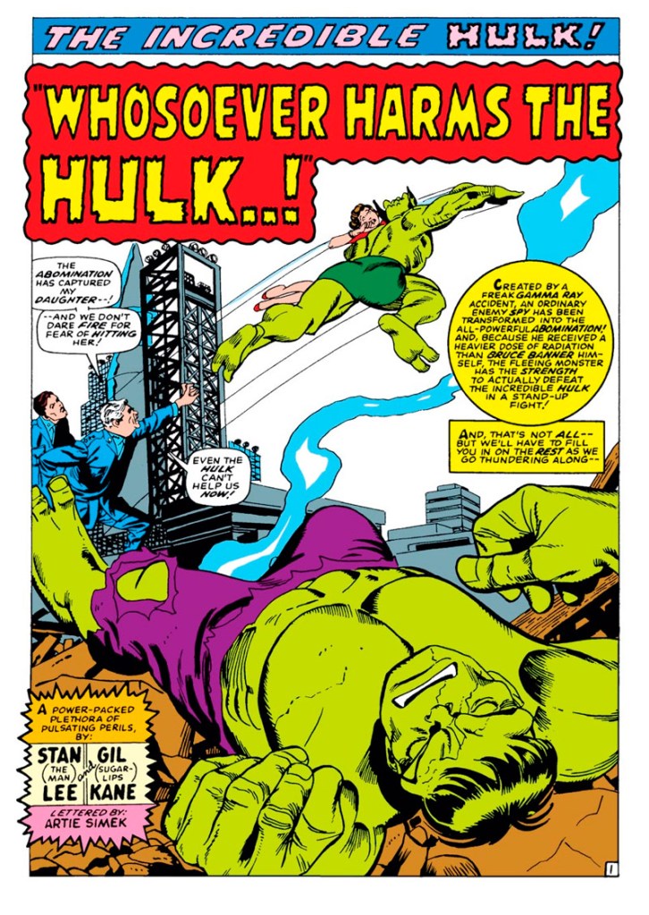 1. I got the first PocketBook Hulk collection, which included the full run of the Hulk’s initial 6 issue series. I missed the 2nd PB collection but got most of those stories in the Marvel Super-Hero reprints. Several years ago, btw, I came across a site that included artwork Gil Kane had done for a short story Kane had done for one of DC’s anthology horror/suspense mags shortly before going to Marvel and which included a giant sea-creature that very closely resembled his rendition of the Abomination, aside from being much larger. Can’t really blame Kane for plagiarizing himself to take a conception for a one-shot character an re-use it for a character who would get a lot more use as a Hulk baddie, and Stan did select Abomination for inclusion in his Bring on the Bad Guys Fireside collection. I’d have thought the Leader may have made a more obvious choice as he had been Hulk’s most prominent baddie, but then the two-part Abomination story made a better fit than any of the stories featuring the Leader that Lee had written (and mostly drawn by Ditko) and which were part of a sprawling multi-chapter epic ending with the Leader’s apparent death. All reprinted in the later Fireside Hulk collection. It wasn’t until well after Tales to Astonish was re-titled for the Hulk and into Roy Thomas’ run that the Leader showed up again. I didn’t start collecting Hulk on a regular basis until issue 160, although I’d gotten quite a few earlier issues over the years, most of which got tossed out during my family’s move from California to Utah in 1971.