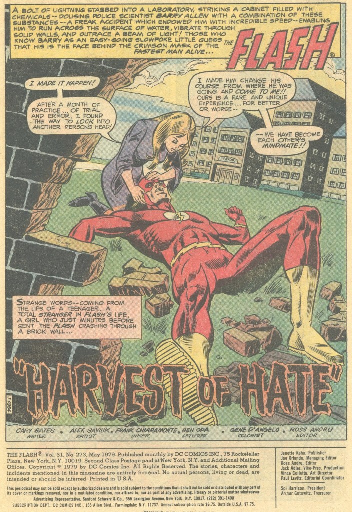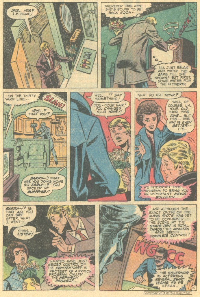 So what’s going on with the Scarlet speedster? Well, for one thing, he’s being stalked by a young woman, Melanie, who possesses ESP powers and has succeeded for the first time in drawing the Flash to her, causing him to smash through a brick wall at super-speed. She’s convinced that she and the Flash are soulmates and that they belong together. The Flash, for his part, has no idea what’s been causing him to do strange things like racing through a wall. But he’s got other problems as well. As Barry Allen, he’s been serving as the police liaison to the Nephron Project that a nearby prison is testing to try to change criminal behavior through brainwashing. It’s a nasty little project, and Barry’s gotten to the point where he’s ready to blow the whistle on how it abuses the inmates. Also, there’s the little matter of the drug smuggling ring that’s being run out of his precinct in the Central City Police Department. Barry found drugs concealed in his lab’s supplies, and needs to let the precinct Chief know. So he doesn’t spend much time wondering about Melanie before heading back towards work.