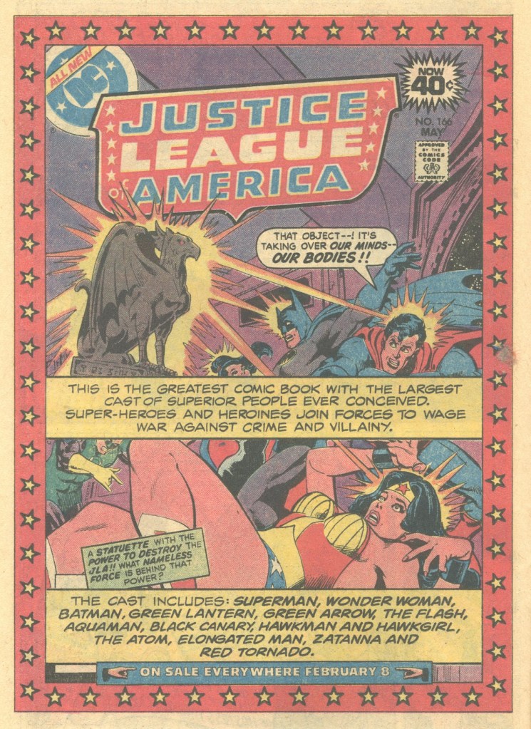 A new month brought new house ads, including this one for JUSTICE LEAGUE OF AMERICA, whose editorship Ross Andru also picked up with the issue being plugged. It’s an interesting choice to plaster all of that promotional copy straight across the cover image like that. There’s something quaintly off-register in describing the JLA as “the largest cast of superior people ever conceived”. That’s some strange phrasing.