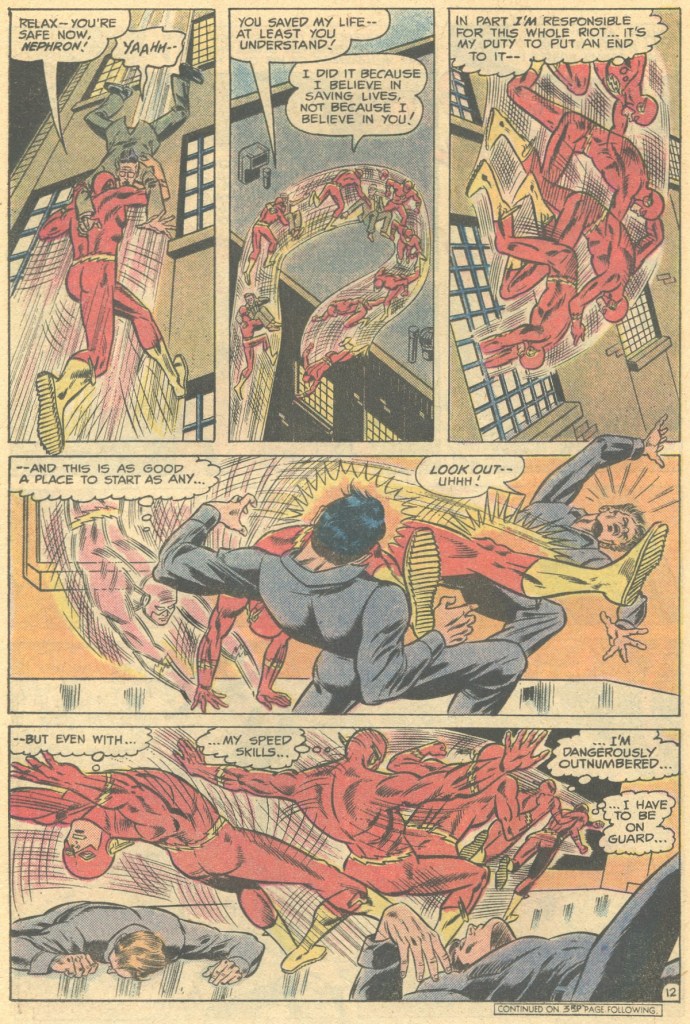 Getting into the action of the issue, flash arrives at the prison just in time to catch Professor Nephron, who has been thrown out of a high window by the rioting inmates that he’s been abusing. Despite having his issues with the program, Flash of course saves the plummeting scientist, depositing him on the roof before wading into the heart of the fray himself. The guards are something of a non-factor here, as the name of the game is the Flash vs. the entire prison population.