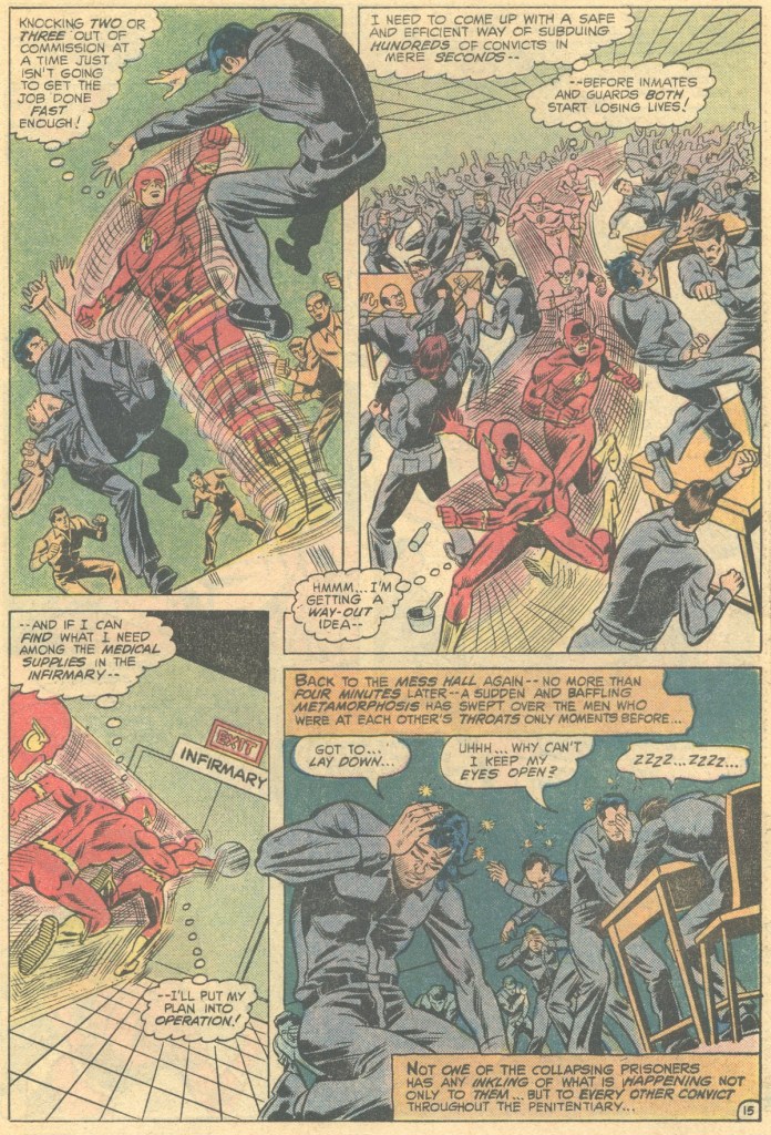 But the truth is, this isn’t really much of a fair fight at all–there shouldn’t be much of anything the inmates can do to tag the Flash. In order to make things more equal and provide at least a bit of suspense in the sequence, Cary has Flash clock himself in the head while trying to avoid some guards, which gives the rioters a chance to take a few cheap punches at him. But this is only a momentary setback, and he proceeds to quell the riot by administering sleeping pills to all of the convicts.