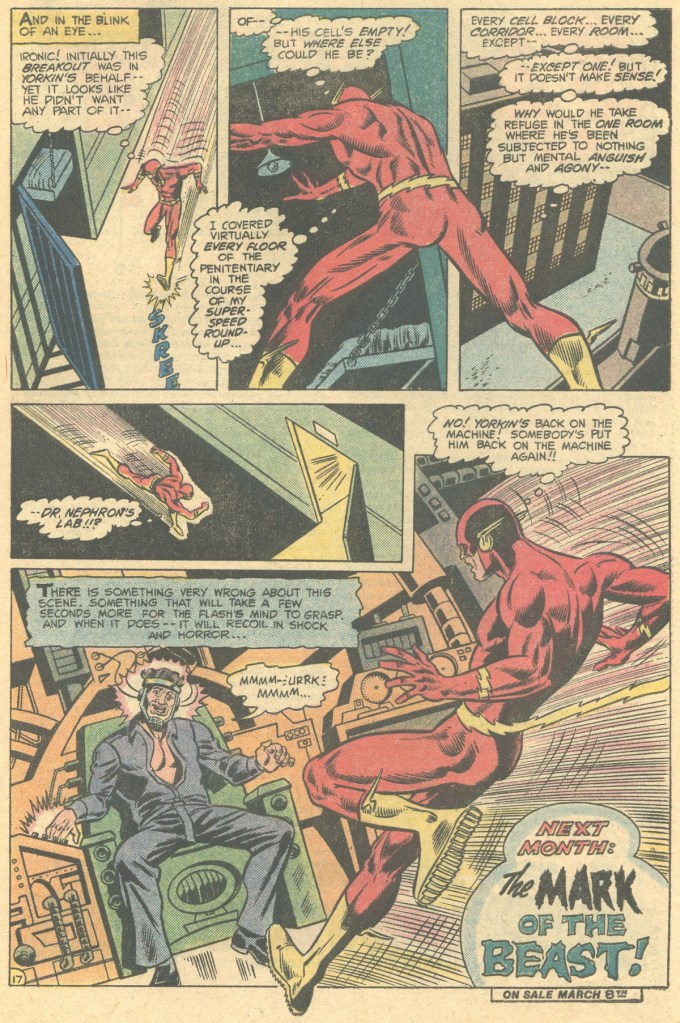 But the one inmate that Flash didn’t see anywhere in the melee is Clive Yorkin, who has been the subject of Nephron’s experiments. Racing through the building to locate him, Flash does eventually find him–and his stunned reaction makes up the climax to this issue. Because without supervision, Yorkin has sought out the Nephron Machine, plugged himself into it and has been giving himself brain shocks–the process having eroded the separation of pleasure and pain in his mind. It’s a weird beat to go out on, but that was the new FLASH all over. And I can’t say that I really loved it.