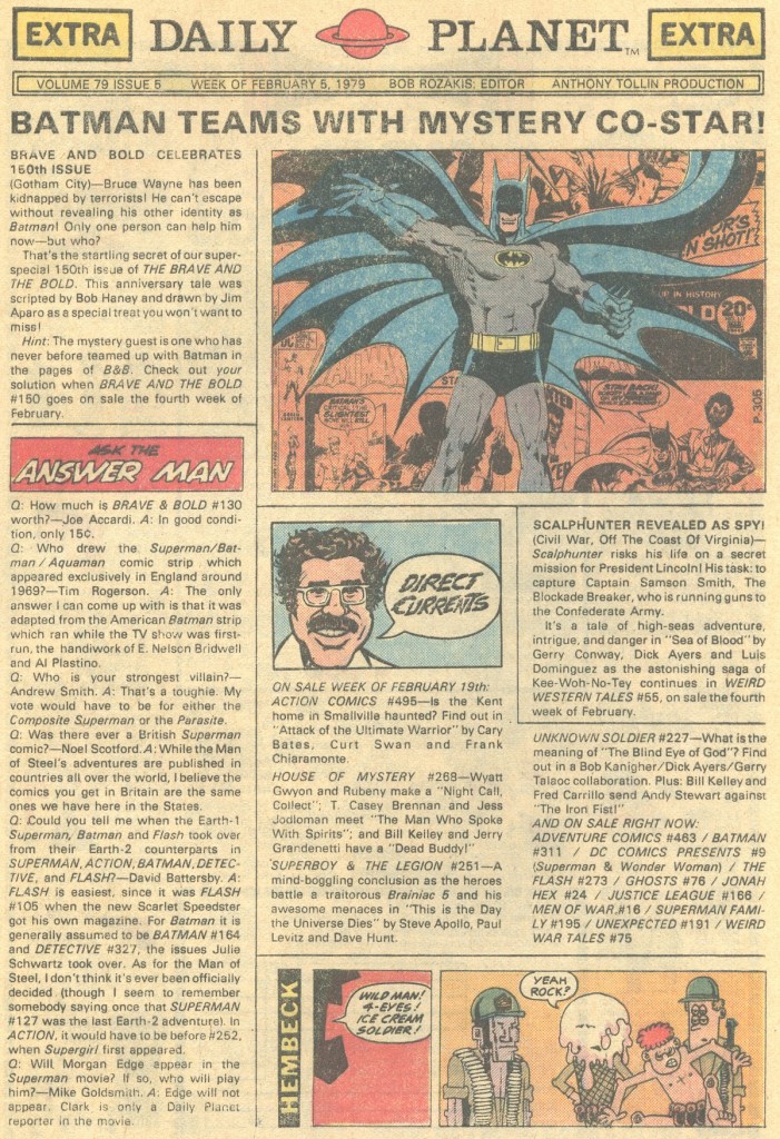 A new week meant a new Daily Planet promotional page and another new goofball cartoon strip from Fred Hembeck. This one makes fun of the nicknames of the assorted members of Sgt. Rock’s Easy Company by treating them literally. It’s not much of a gag, but what do you want from two postage-stamp-sized panels?