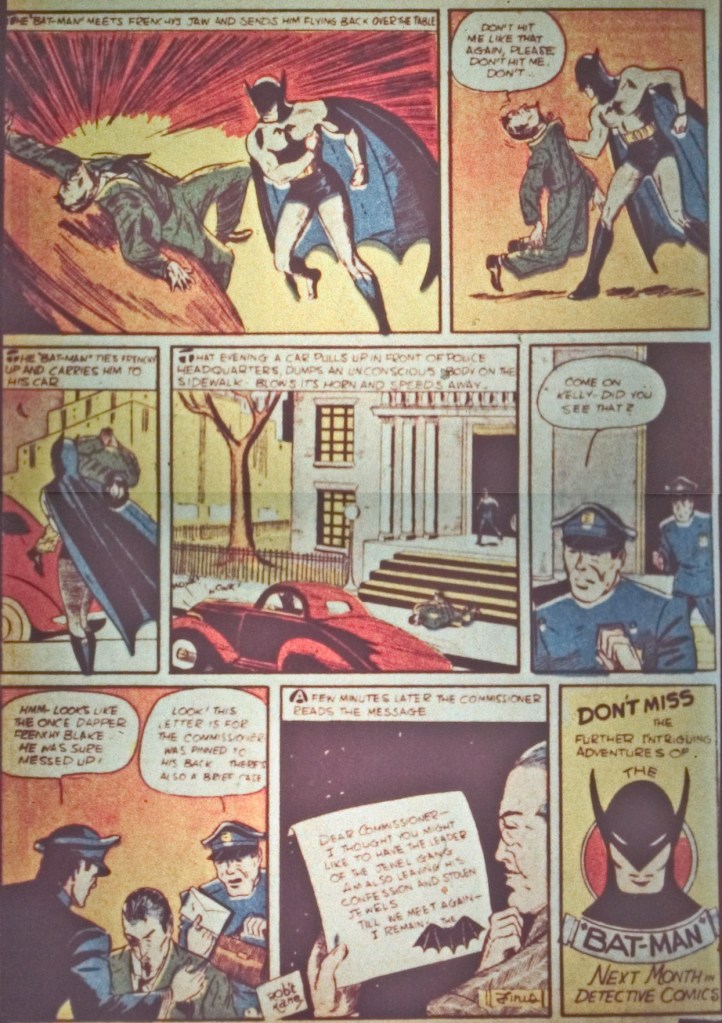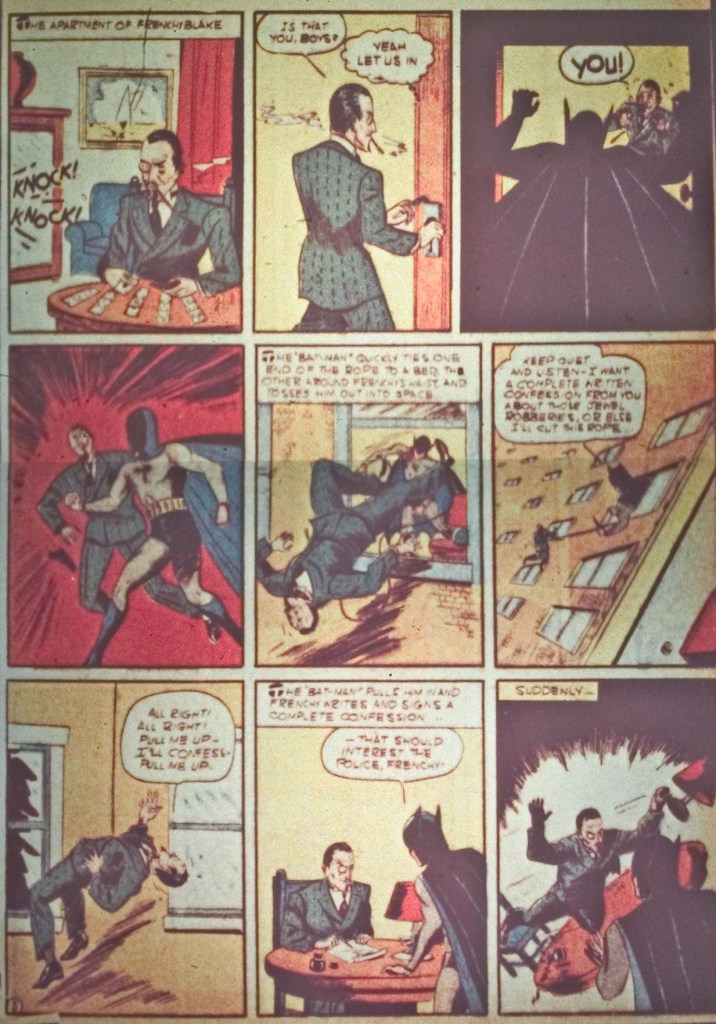 1. Well The Bat-Man definitely killed that thief with the knife when he kick flipped him of the roof ( first page bottom second panel ). At least at the beginning of his comic book crime fighting career he didn’t have problems taking a life.