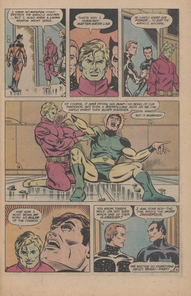 With no other course open to them, Legion leader Wildfire is being pressured by some of his teammates to use the Miracle Machine, an all-powerful device left in the Legion’s care by the powerful alien race the Controllers. But it’s so powerful, able to turn thought into reality, that Wildfire is hesitant to use it for fear that they will somehow make things worse or obliterate the universe. Instead, Wildfire accedes to Brainiac 5’s demands, placing him in charge of the Legion despite the fact that he’s clearly out of his mind. Brainy has a plan to defeat Omega, though–and it requires the services of retired legionnaire Matter-Eater Lad.