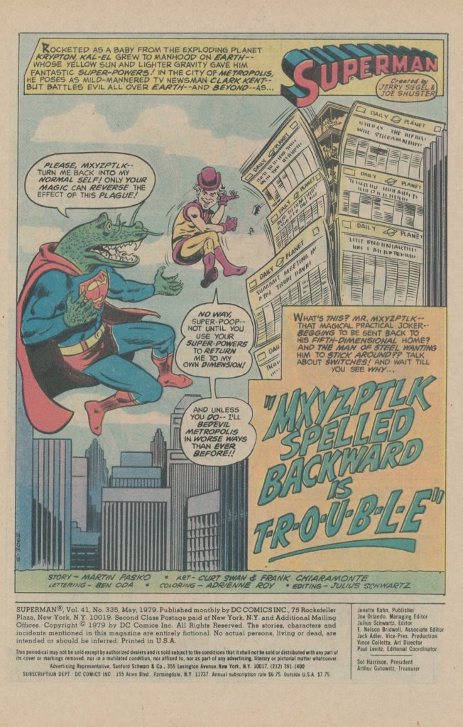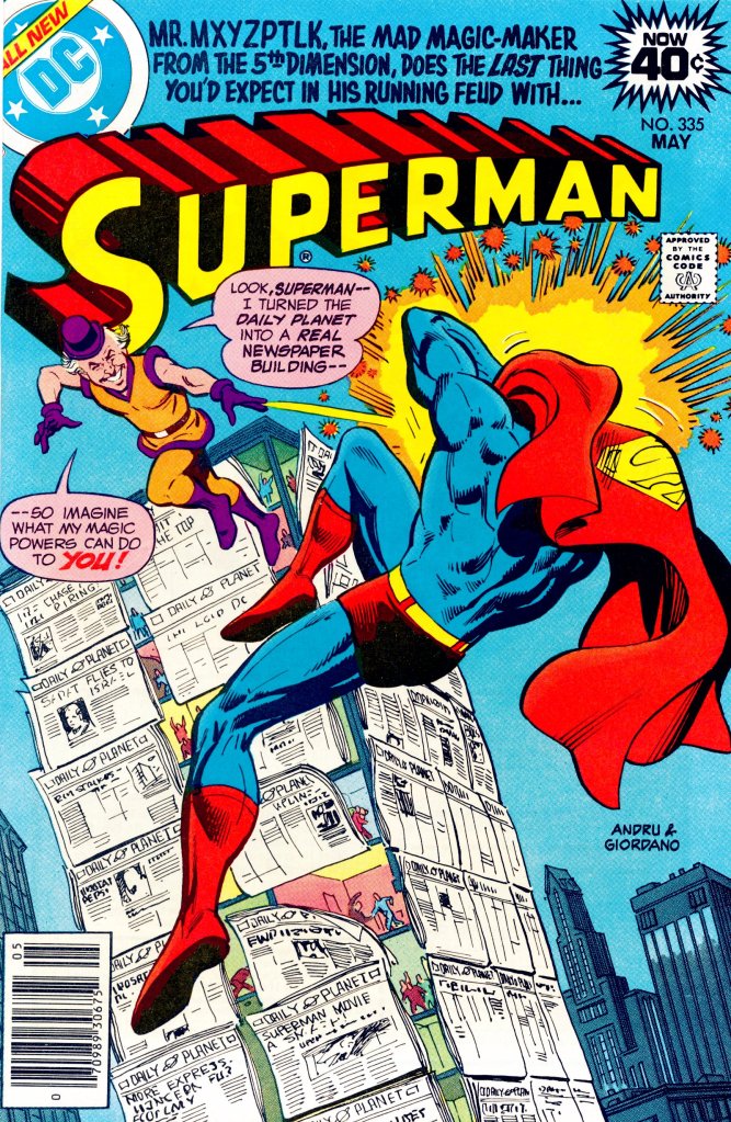 That cover is bending over backwards to maintain the mystery of what Superman is transformed into… but it visually reads like he doesn’t have a head. The giant newspapers covering the building don’t work either… it just looks like Superman and Mxyzptlk are fighting around a normal sized kiosk despite the word balloon saying what it is.