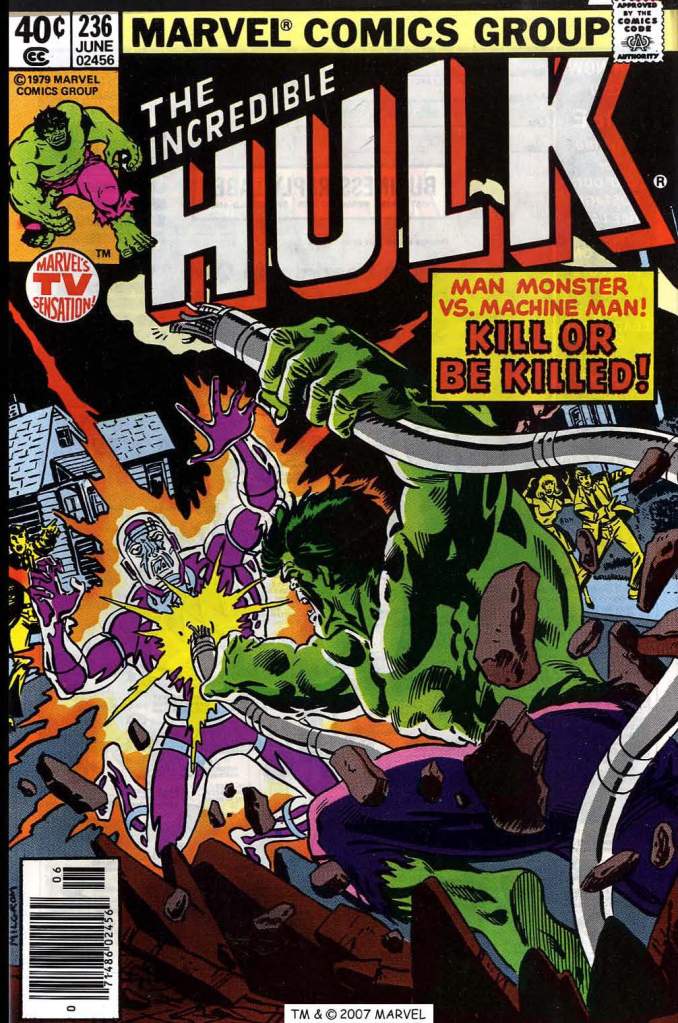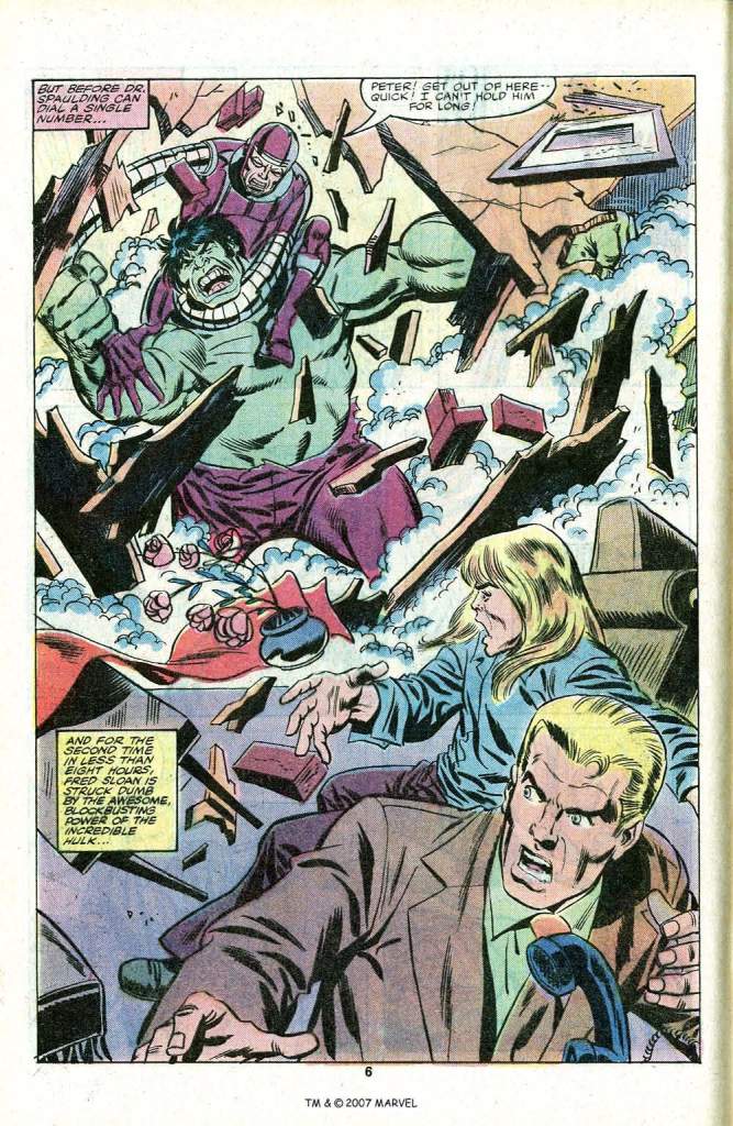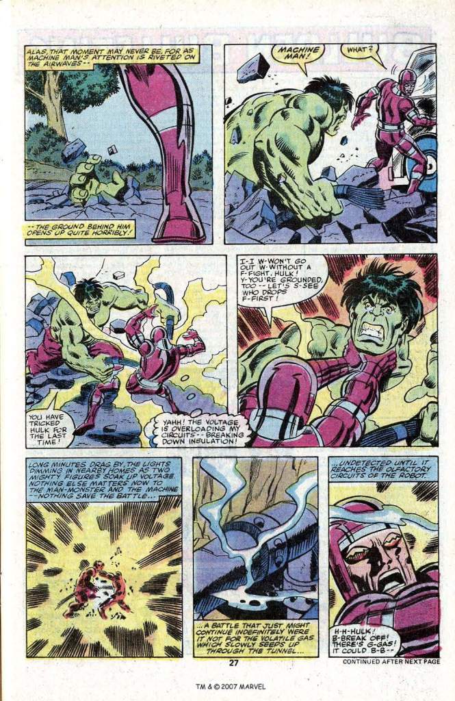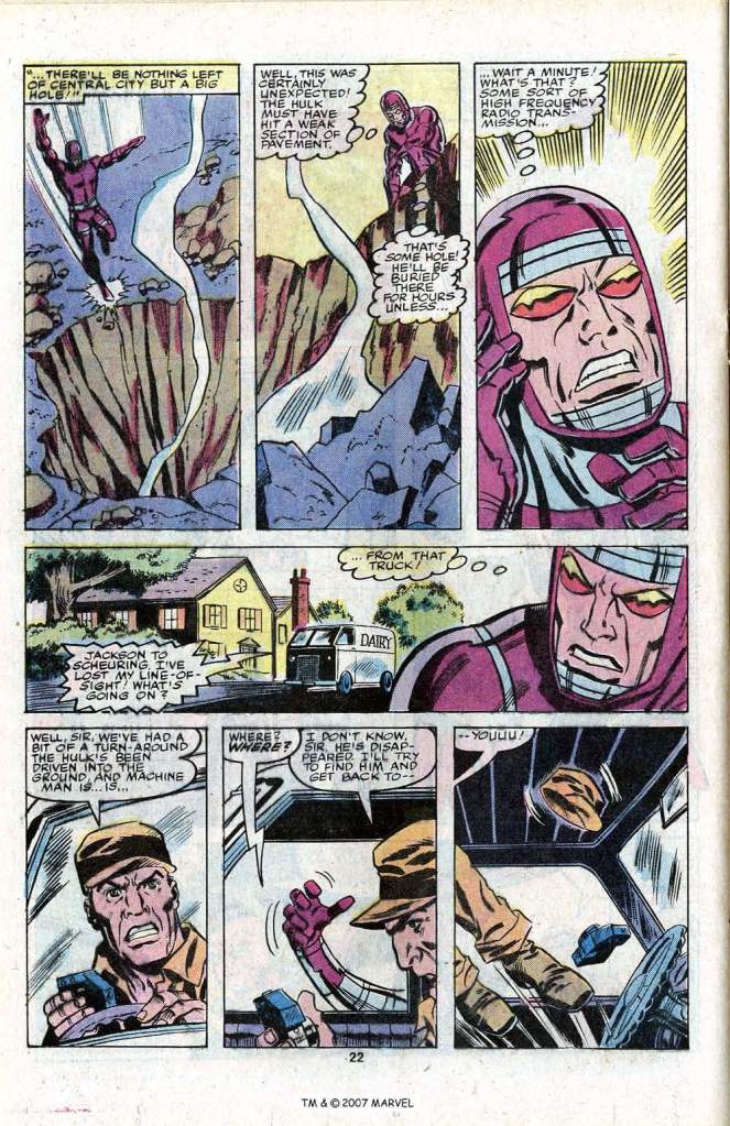 The Hulk, meanwhile, has been driven through the pavement by his fall. But this brings back a dim memory in the Green Goliath’s mind of an earlier battle he’d had with the Thing in which Ben Grimm socked him with electrical cables torn out of the ground. The Hulk decides to replicate that strategy against Machine Man. The amount of current in the neighborhood is enough to overload Machine Man’s circuits, but he’s able to feed it back into the Hulk through physical contact. So now it’s a question of which hero can take the jolt the longest.