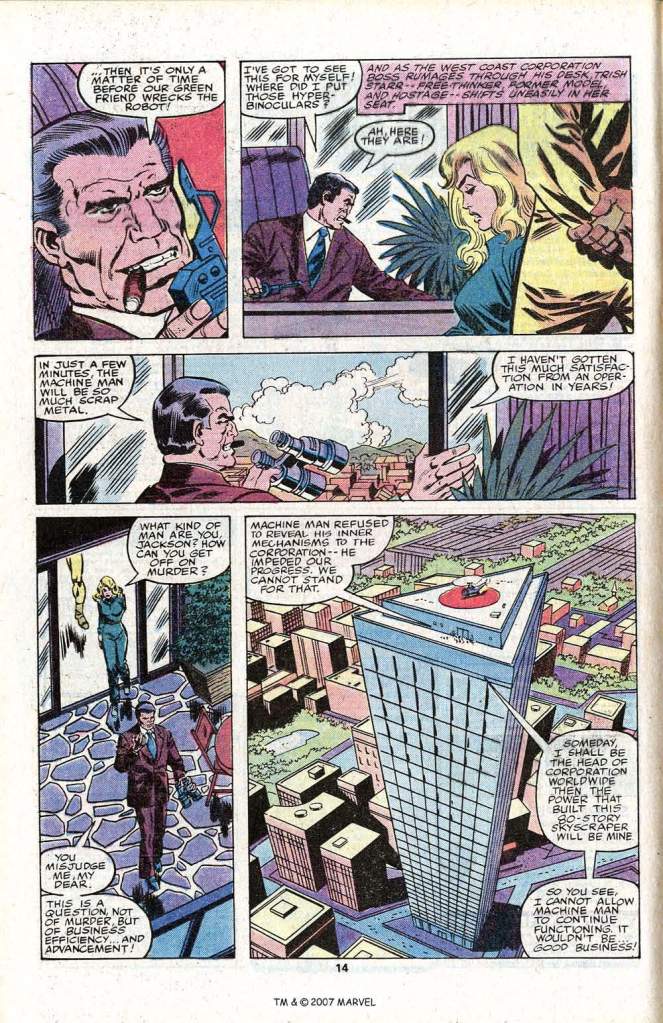As with most issues of INCREDIBLE HULK, action and mayhem were the name of the game, and so Aaron Stack and Bruce Banner’s hulking alter ego mix it up for page after page, with Machine Man never really able to halt his foe’s forward progress towards smashing both him and Spaulding alike. Nearby, Corporation executive Jackson receives reports of how his gambit is going. He pulls out a pair of hyper-binoculars in order to watch events with his own eyes. Captive Trish Starr looks for some way to liberate herself and turn things around on Jackson, but no such opportunity presents itself.