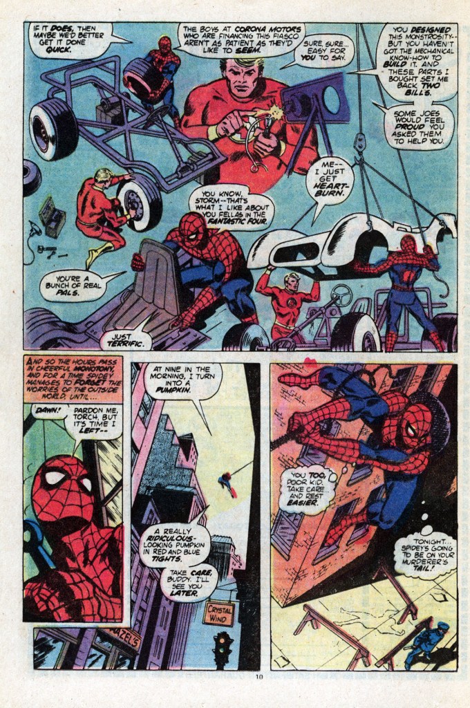 Case in point: Conway had been asked to introduce a Spider-Mobile, as toy manufacturers wanted to be able to license a vehicle for the wall-crawler (not really caring that driving a car was the antithesis of web-swinging and wall-crawling.) Gerry wasn’t happy with having to do this, but he made the best of a bad situation by having Spidey and the Human Torch spend several issues constructing the new Spider-Mobile, and then having it turn out to be much more of a problem than it was worth. Spidey winds up driving it off the edge of a pier by accident, getting rid of the absurd vehicle (at least for the moment.) But Marvel had a spider car thereafter that could be licensed.