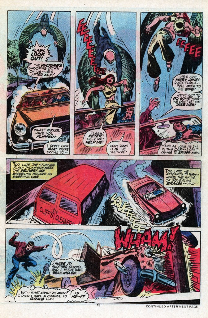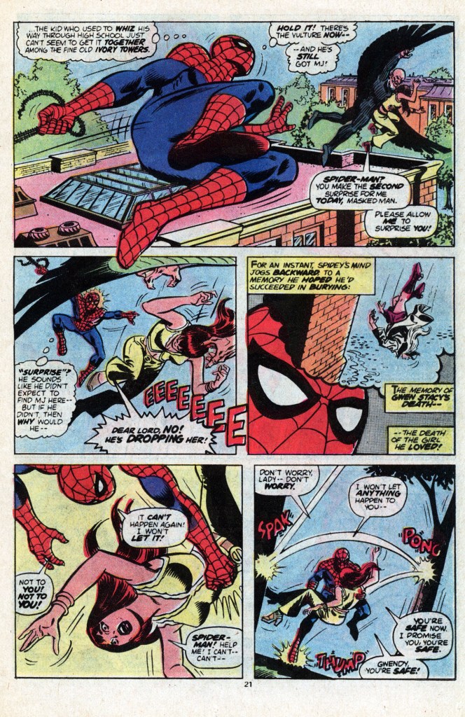 After class–and a conversation with Professor Miles Warren concerning how Peter’s absenteeism is going to cause him to flunk another class, Peter and MJ take a ride with Flash Thompson in his new car. It’s during this joyride that the Vulture swoops down and snatches MJ up like a bird of prey. So startled is Flash that he loses control of the vehicle, and it crashes. Neither man is badly hurt, and this gives Peter the opportunity to change to Spidey and go to the rescue. Web-swinging frantically, he catches up with the Vulture just in time to see the villain drop MJ towards the ground below. This triggers Spidey’s PTSD about having failed to save Gwen Stacy from a similar fate, and he hurls himself bodily forward, snatching up MJ and ricocheting to safety on the ground below. During this period, the spectre of Gwen hung over pretty much every story, giving her demise an almost instantly legendary status.