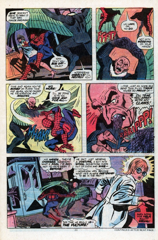 With MJ safe, Spidey gives chase, pursuing the Vulture back onto the campus. It turns out that his target wasn’t truly MJ at all–spotting her in Flash’s convertible was merely a fortunate coincidence. The person he’s really out to kill is an unnamed lab assistant in the biology department. Spidey jumps in to protect the woman, and as he and the Vulture tussle, he realizes that his foe had been transformed–he’s not wearing a birdlike costume, he’s actually become a strange man/bird hybrid. The fight carried on outside, where the campus police can get into the act, and where Harry Osborn can witness it. From Harry’s thoughts, it’s clear that he knows that his father was the Green Goblin and that he intends to follow in the family business. But that’s a problem for another issue.
