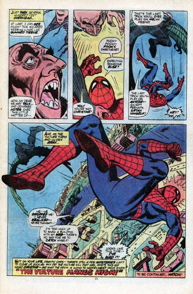 But we’re getting to the end of his issue, and so it’s time to set up a cliffhanger. The Vulture soars high into the sky with Spidey hanging on for dear life, and then when the pair are super-high above the ground, he knocks the wall-crawler loose, sending him plummeting towards the ground below. Given that we just saw Spidey save MJ from a similar fate (albeit a drop that wasn’t quite this high) it doesn’t really seem much like our hero is in such terrible trouble here. Gerry or somebody must have liked this cliffhanger, though, as it would be repeated a number of times over the next couple of years.