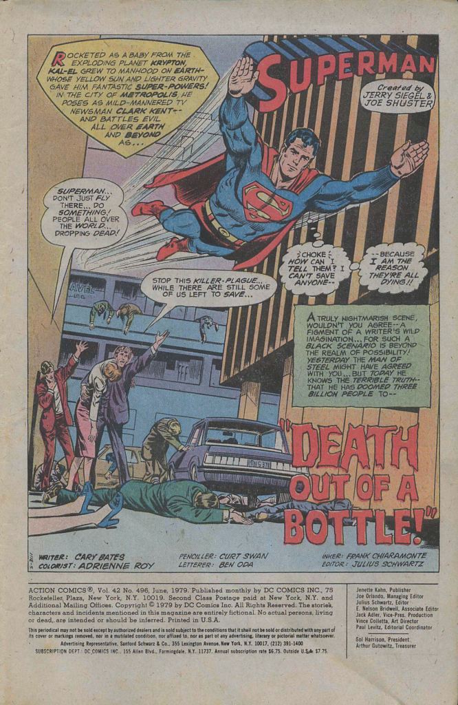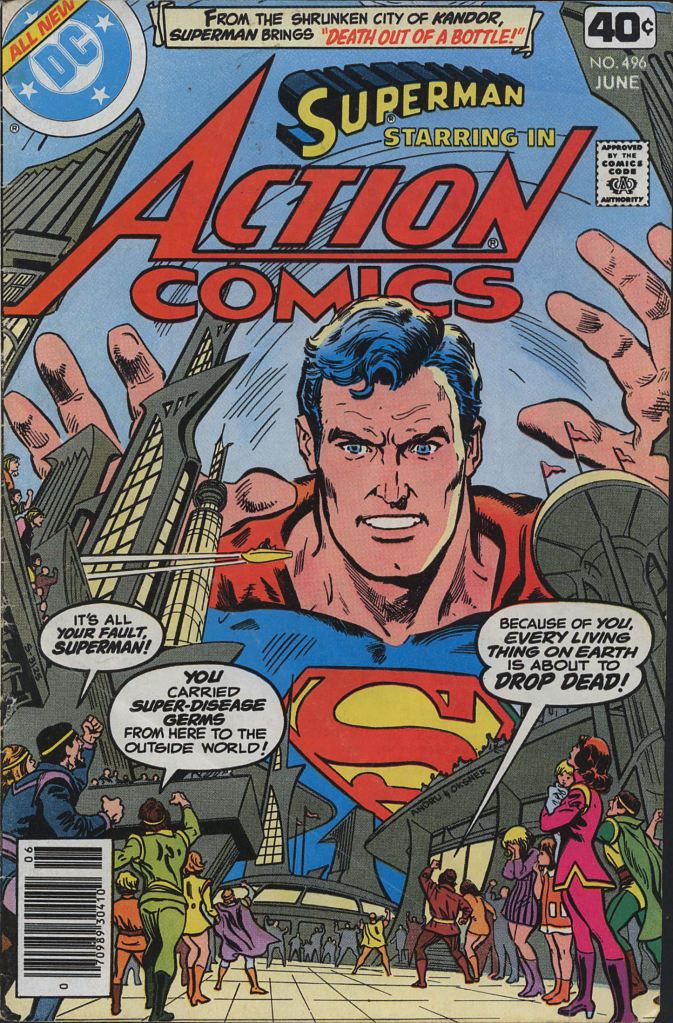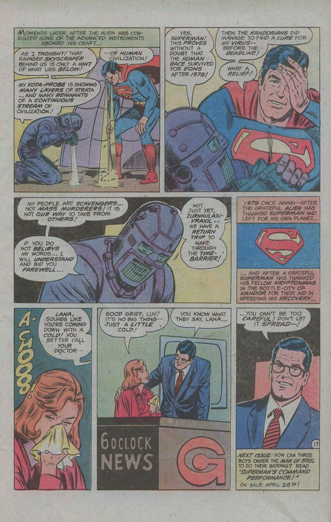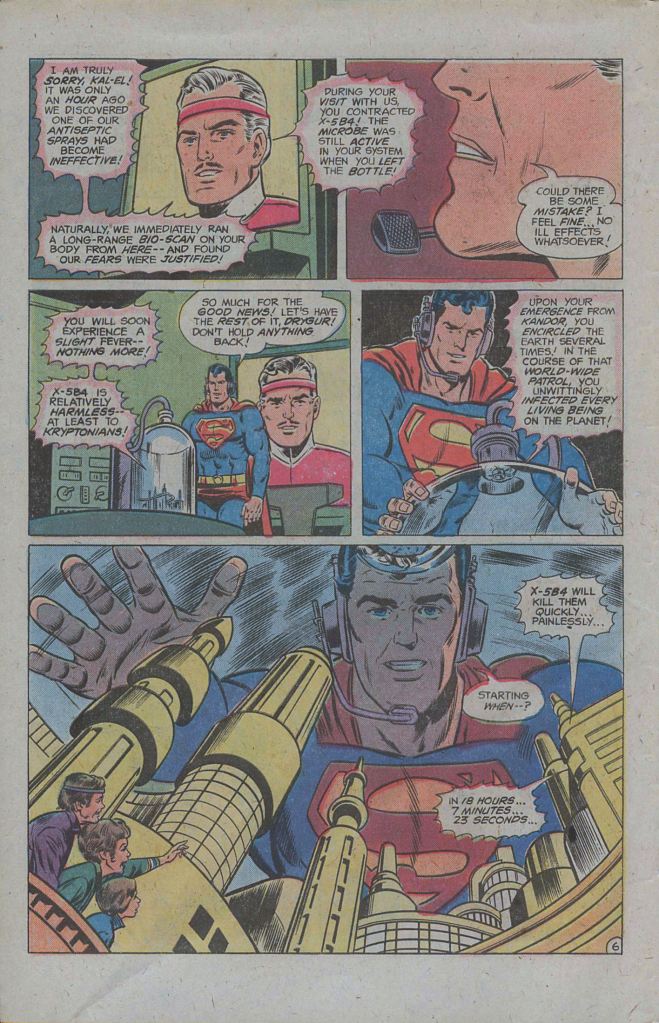 And this story does have a pretty good hook to it. After a premable that sets up the overall status quo, Superman is summoned to his Fortress by the inhabitants of the Bottle City of Kandor, who had awesomely bad news to tell him. The last time he visited their city, one of their antiseptic sprays malfunctioned, meaning that Superman returned to his normal size carrying a Kryptonian bacteria with him: X-584. This illness is akin to the common cold for Kryptonians, but it will prove fatal to all of humanity in less that a day. And in carrying out his worldwide patrol, Superman has unknowingly spread it to every corner of the world.