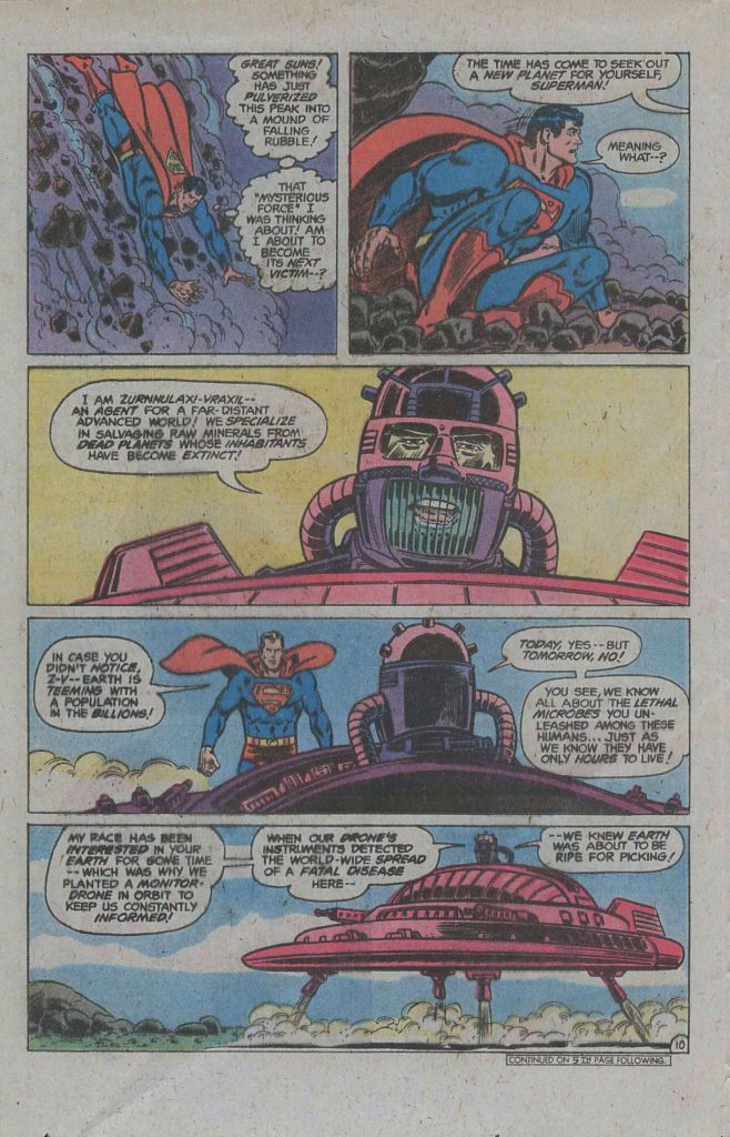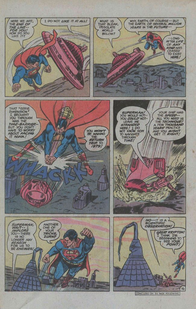 The Kandorians has intended to create a false menace to occupy Superman’s time and to keep him under pressure so that the antidote could sweep the Earth. But it turns out that Z-V and his scavenging threat isn’t a part of their design, he’s a genuine menace. So now the Kandorians can only watch and hope that Superman can cope with the threat. Elsewhere, the Man of Steel finds himself under fire from Z-V’s spacecraft, weaponry that can likely kill him. Seeking a strategy to turn the tide, he creates a vortex into which Z-V’s ship also passes, pulling it through the time barrier into the far future. Superman intends to strand the would-be scavenger there, on a barren and desolate Earth, but Zurnn indicates that there’s no longer any reason for them to fight.